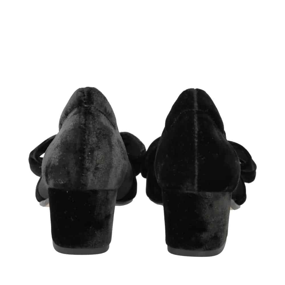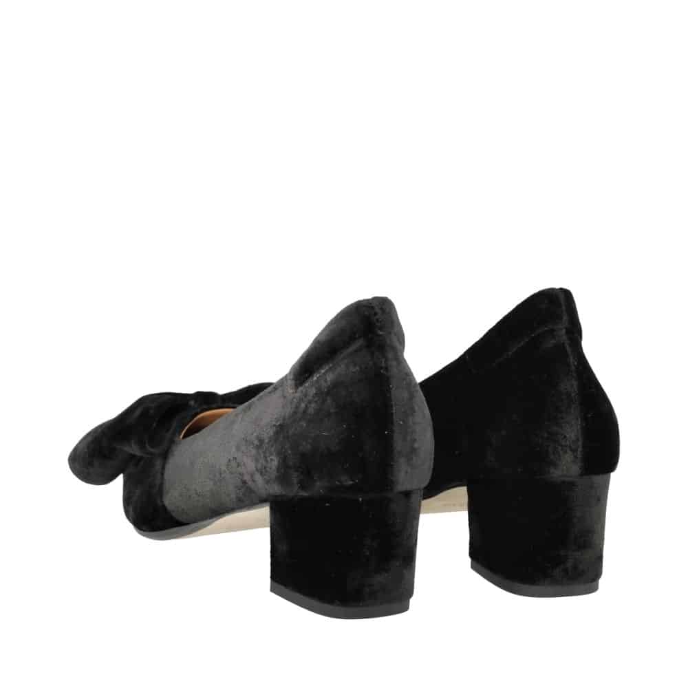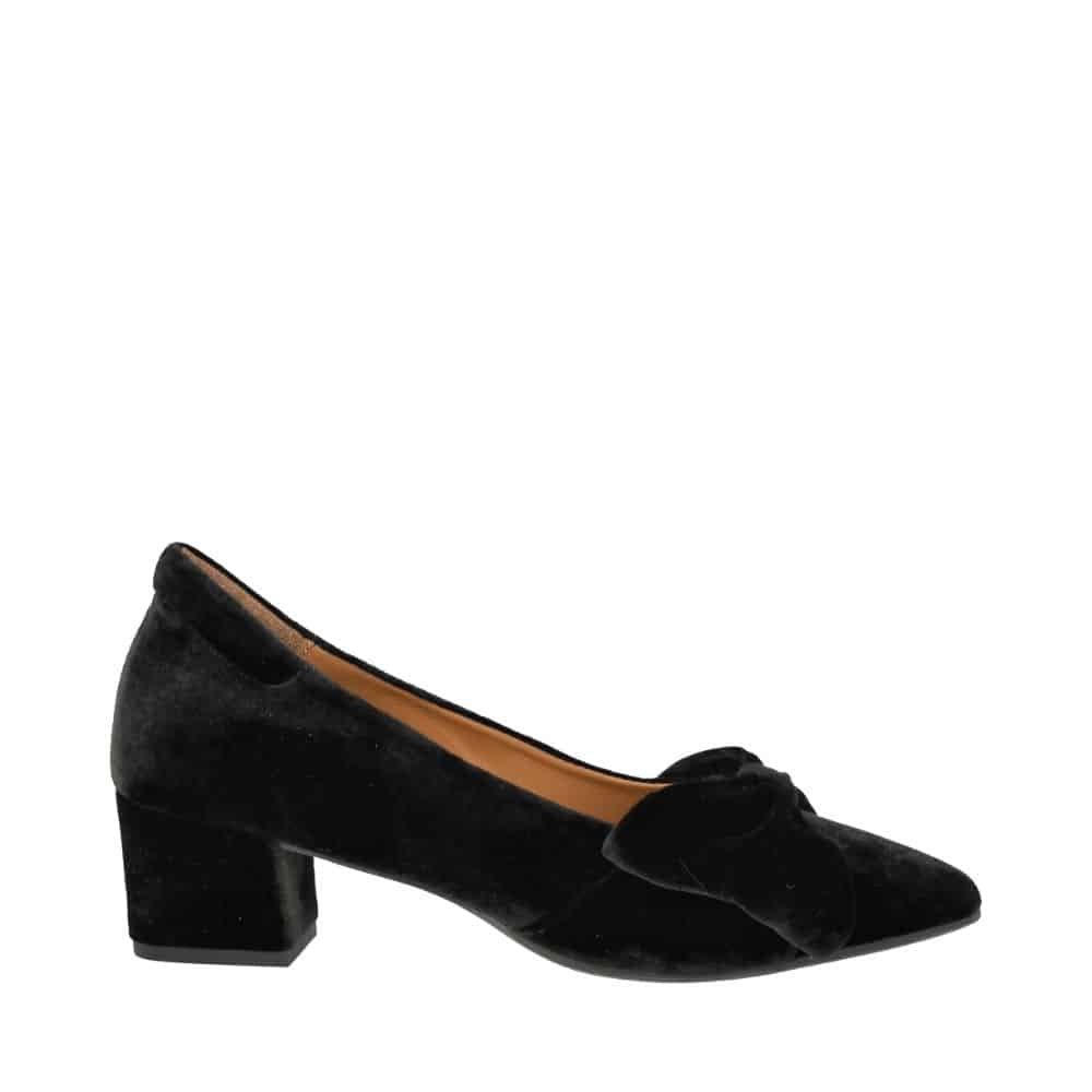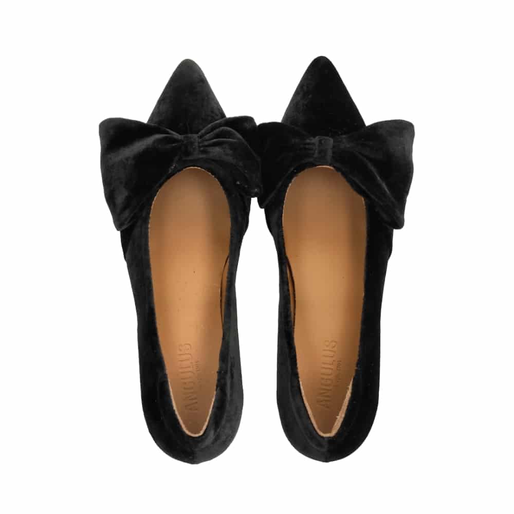 Angulus pumps til dame i sort velour. Smuk pumps med tidløs elegance og høj komfort. Overdelen i blød velour kombineres med en spids snude og en elegant sløjfe, der giver et stilfuldt udtryk. Indvendigt er skoen lavet af glatskind og udstyret med en blød sål, som sikrer god komfort. Den 5 cm høje blokhæl giver stabilitet og understreger det feminine look.