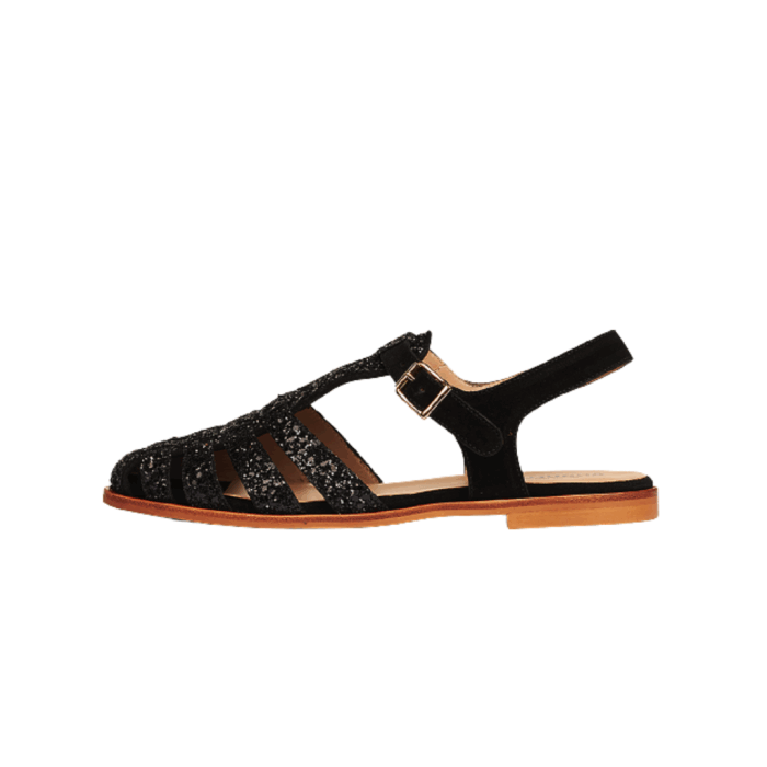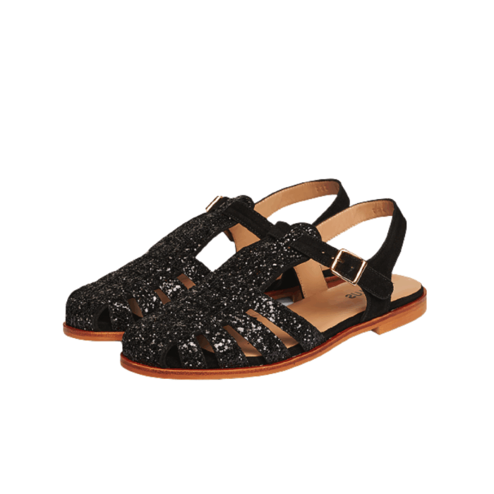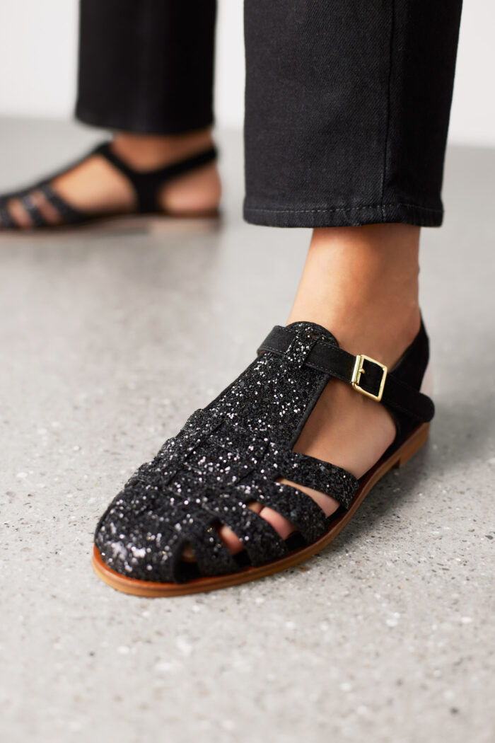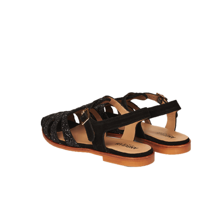 Angulus Sandal i Sort Glimmer til Dame. Smuk sandal i høj kvalitet fra Angulus i den fineste sorte glimmer farve med flotte fletdetaljer. Sandalen har lukket tå foran, hvilket giver den et smart og moderne design samtidigt med, at der kommer rigeligt luft til fødderne. Modellen har justerbar rem, så du kan tilpasse den til lige netop dine fødder. Sandalen er i høj kvalitet, hvilket giver god komfort for dine fødder.