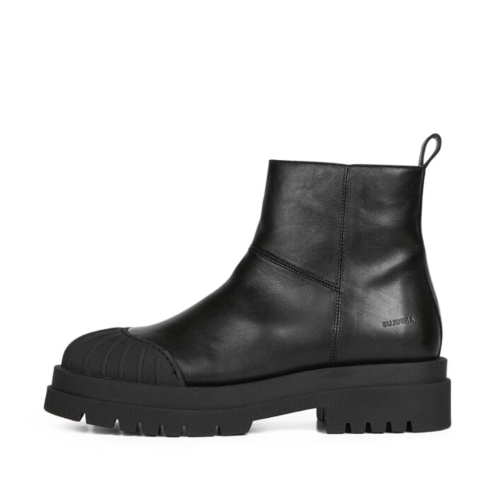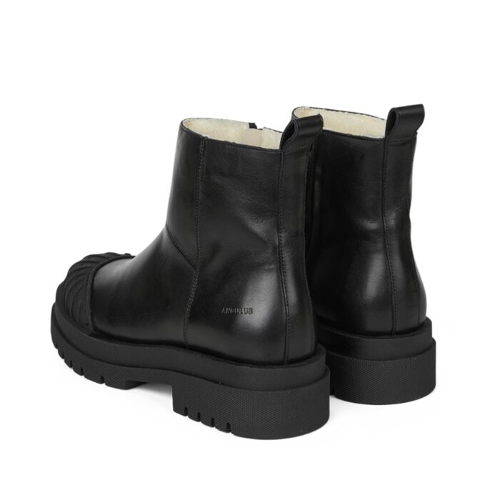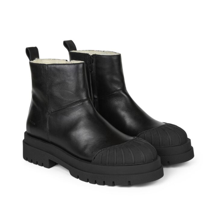 Angulus støvle til dame i sort. Mød vinteren med stil og komfort i disse chunky vinterstøvler i naturligt og åndbart skind med det blødeste uldfoer som tilføjer varme og isolering. Støvlens rundede snude, lave skaft med strop og lynlåslukning, samt det prægede logo ved hælen, giver den et moderne og funktionelt udtryk. Den chunky, fleksible sort tracksål i gummi, der strækker sig op over snuden, tilføjer ikke kun et trendy touch, men sikrer også solid trædeflade og ekstra beskyttelse.