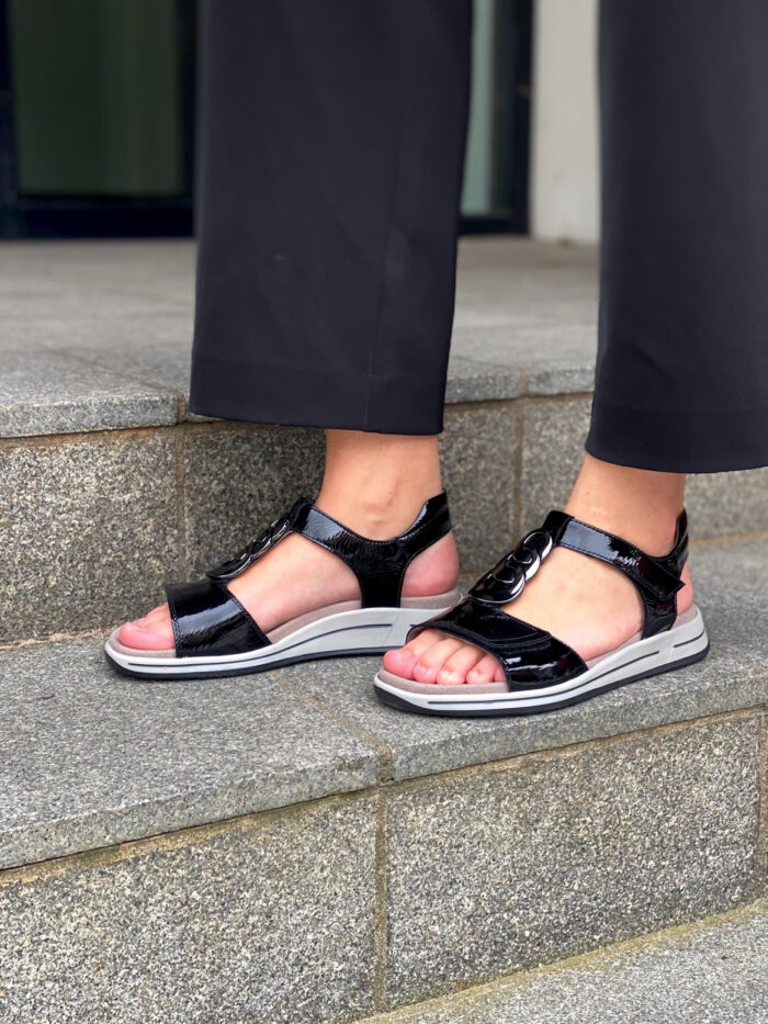 Ara Sandal i Sort til Dame. Smuk sandal i sort, med de fineste detaljer. Modellen har en blød skindoverflade, samt udtagelige såler. Modellen har 2 justerbare velcro remme, som gør det nemt at komme i/af den.