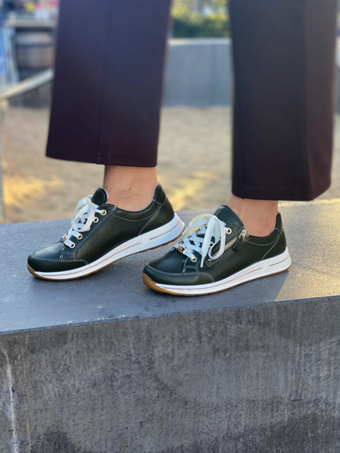 Ara Sneakers i Grøn til Dame. Smart sneakers, i en flot grøn farve med fine detaljer. Modellen har en lækker blød skindoverflade, samt udtagelige såler. Modellen har lynlås på ydersiden, samt justerbar snøre.