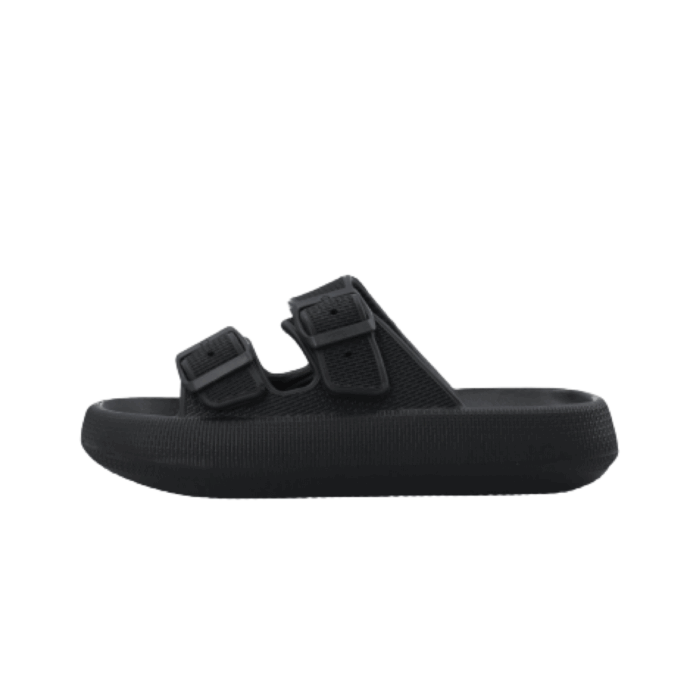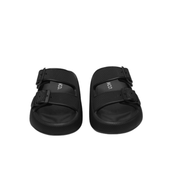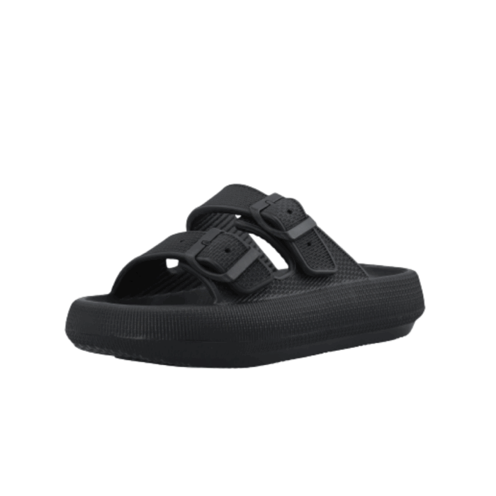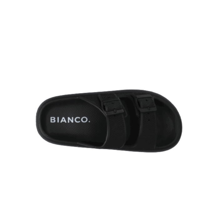 Bianco Slippers i Sort til Dame. Lækker slippers/sandal fra Bianco i en flot sort farve med spændedetaljer. Modellen har en god pasform og er dejlig blød, så man kan holde til at have den på i lang tid. Sandalen har slip-in funktion, der gør det nemt at komme i/af den. Modellen er almindelig i størrelsen. Perfekt til at tage med på ferie i poolkanten og på stranden.