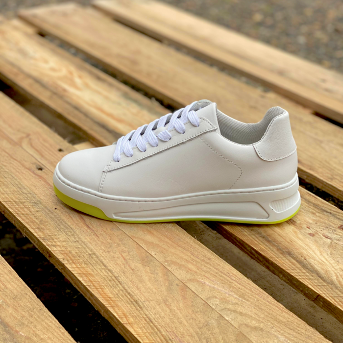 Bianco Sneakers i Hvid til Dame. Lækre Sneakers med flotte detaljer i form af en flot lime sål, hvilket giver skoen et moderne look. Hvis du ligger mellem to størrelser anbefaler vi at gå en størrelse op.