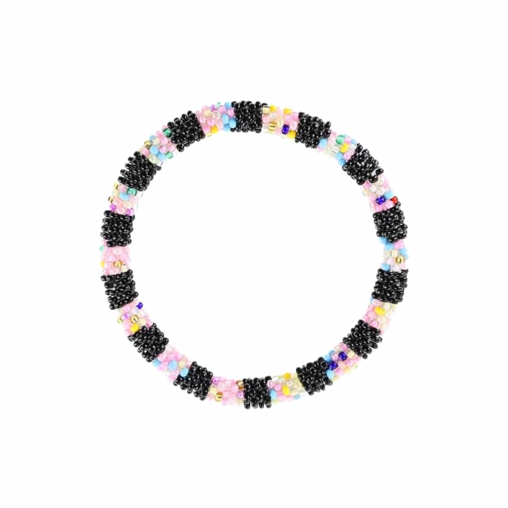 By Stær nepal armbånd i sort/lyserød kombi til dame. Giv dit look et farverigt løft med dette håndlavede Nepal armbånd fra By Stær. Armbåndet er fremstillet af små, fine glasperler og broderet med bomuldsgarn, hvilket giver et unikt og feminint udtryk. Denne variant kommer i en smuk sort og lyserød kombination, hvor farven sort og forskellige sommerfarver skaber et elegant design. Brug det alene for et enkelt udtryk eller miks det med flere for et mere personligt look. Armbåndet er onesize og designet til at rulles over hånden. Indvendig omkreds: ca. 17-18 cm