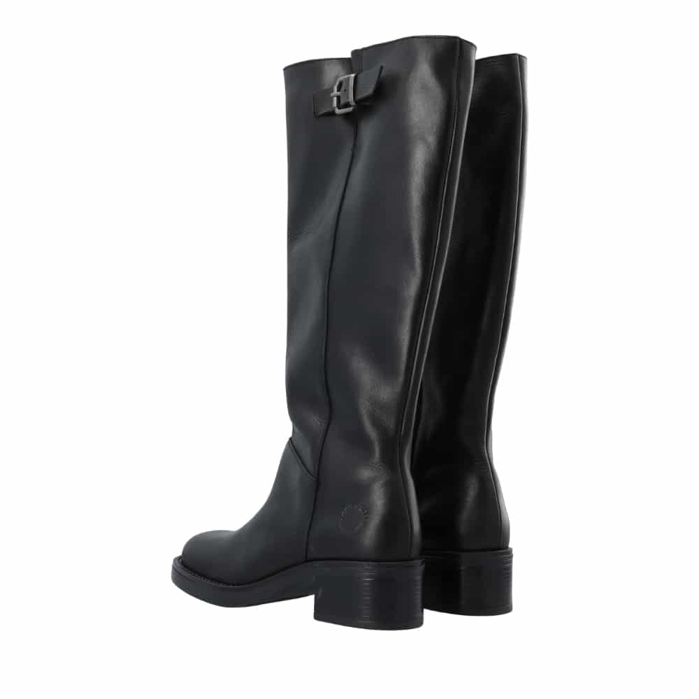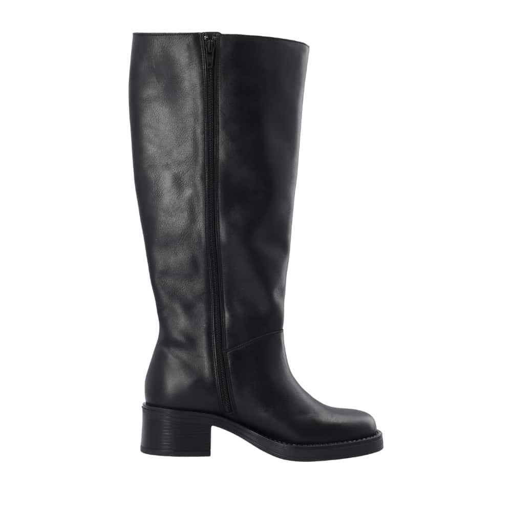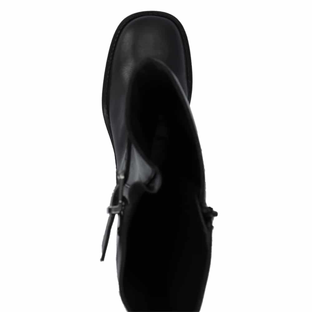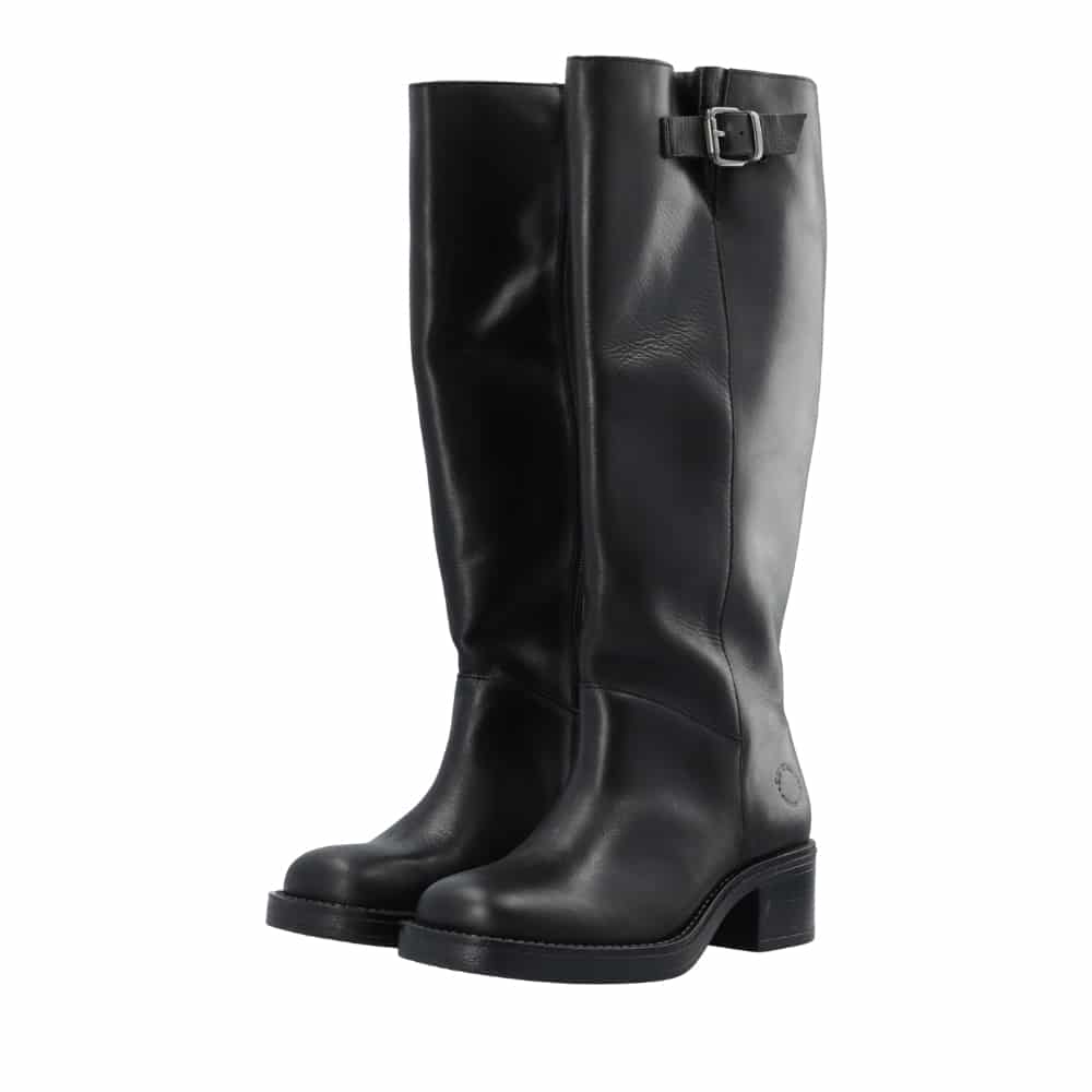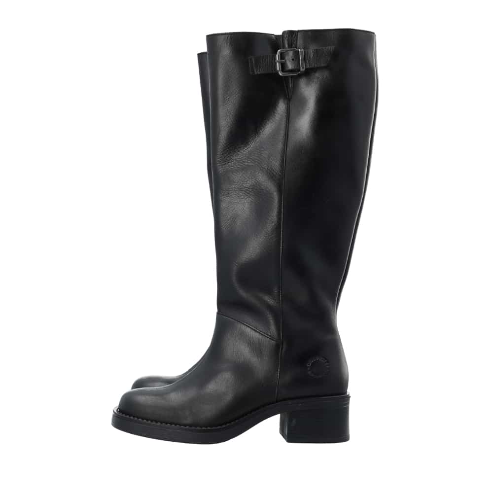 Cashott Casrikke Wide Pull lang støvle til dame i sort. Elegant sort støvle med en tekstureret skindoverdel, som tilføjer et moderne touch. Modellen er udstyret med en praktisk lynlås på indersiden og en justerbar spænde øverst på skaftet, der giver en perfekt pasform. Indvendigt finder du en blød indersål, der gør støvlen behagelig at have på hele dagen. Den cirka 5 cm høje blokhæl giver et stilfuldt løft.