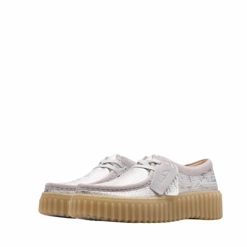 Clarks Torhill Bee sko til dame i metallisk sølv. Denne sko er et moderne valg med en flot kombination af tekstur og elegance. Den bløde skindoverdel kombineret giver en komfortabel pasform hele dagen. Sølvfarven og de fine detaljer tilfører et feminint og moderne udtryk. Den udtagelige indersål af skind med ekstra polstring giver støtte til både hæl og forfod. Skoen tilpasses nemt med snørebåndene, mens den kraftige gummisål fuldender looket med et moderne twist.