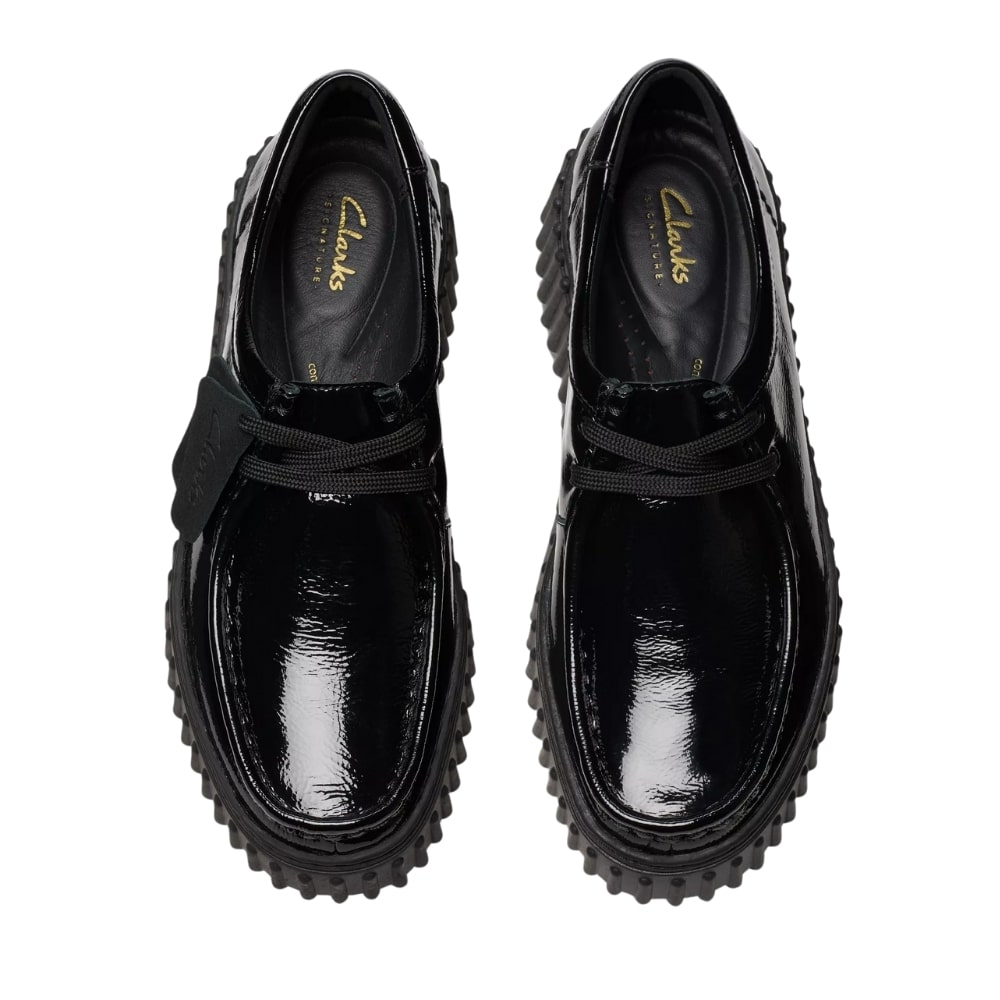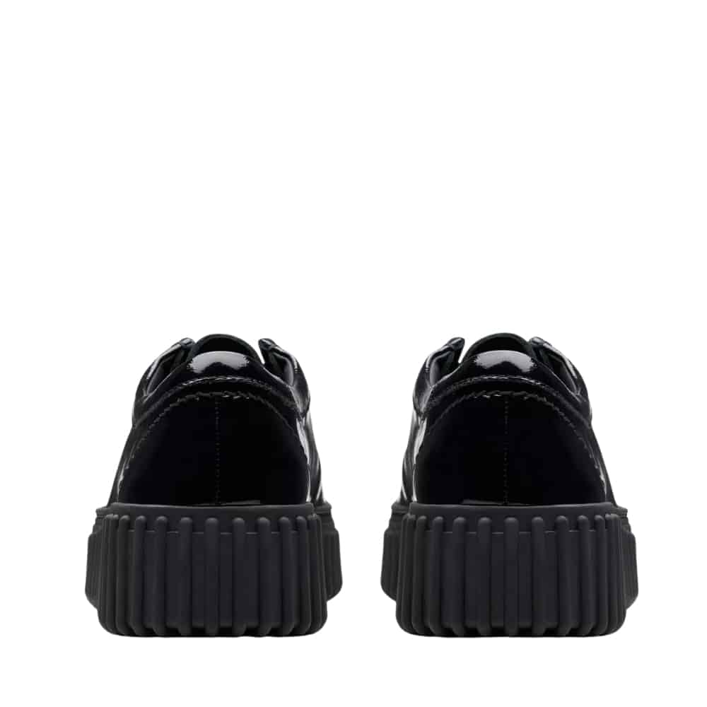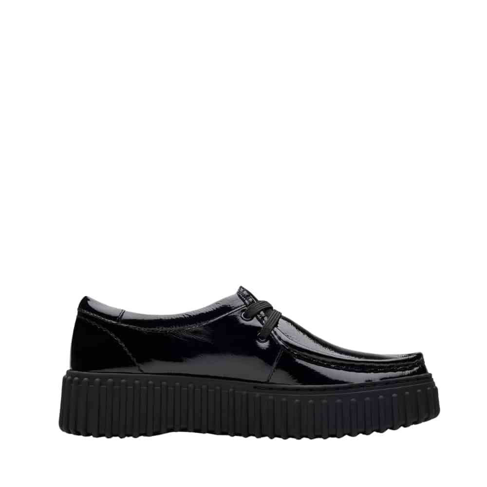 Clarks Torhill Bee sko til dame i sort lak. Stilfuld sko i sort lak, der kombinerer moderne design med feminine detaljer. Den bløde skindoverdel giver en behagelig og fleksibel pasform, mens snørebåndene gør det nemt at justere efter behov. Indvendigt finder du en udtagelig skindsål med ekstra polstring, som støtter både hæl og forfod og giver komfort hele dagen. Den kraftige gummisål på 4 cm fuldender looket med et trendy og stabilt udtryk.