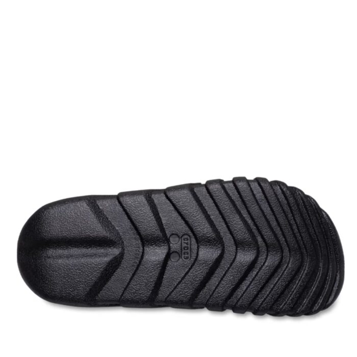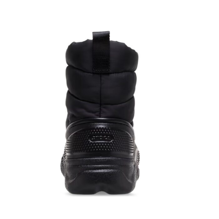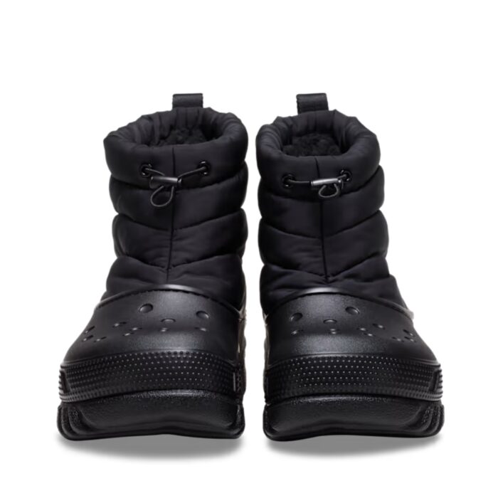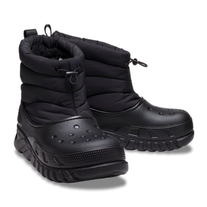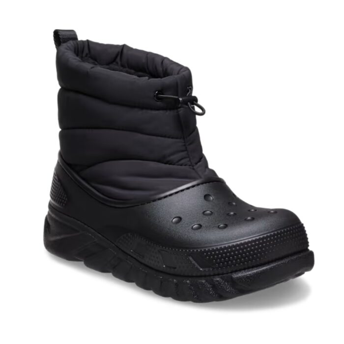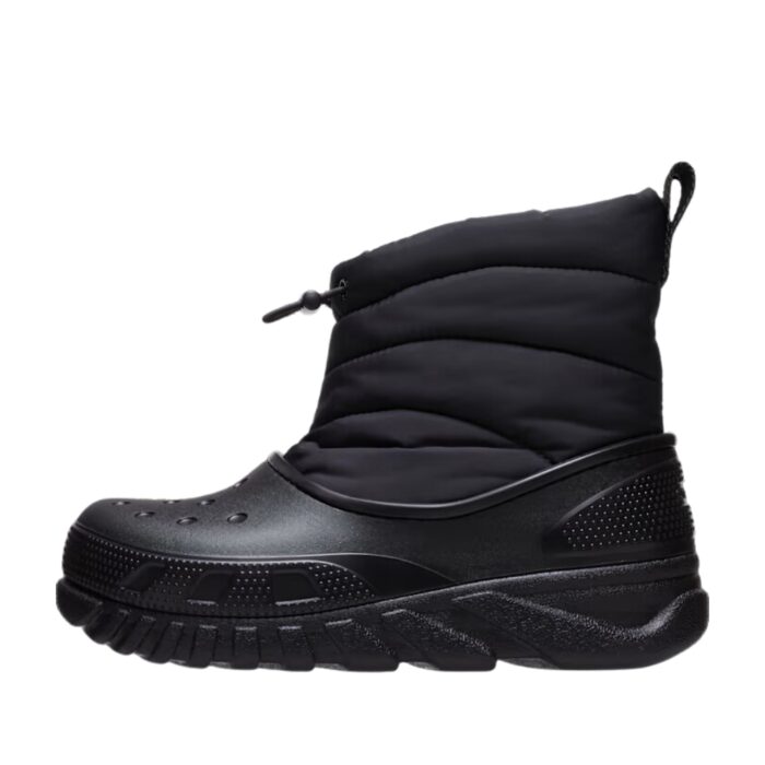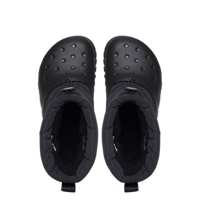 En sort unisex gummistøvle fra Crocs. Denne behagelige gummistøvle har en indvendig foring. Støvlen har faste såler, der er permanent fastgjort. Den er udstyret med elastiske snører, som gør det nemt at justere pasformen. Støvlens skaft er lavet af blødt og komfortabelt materiale