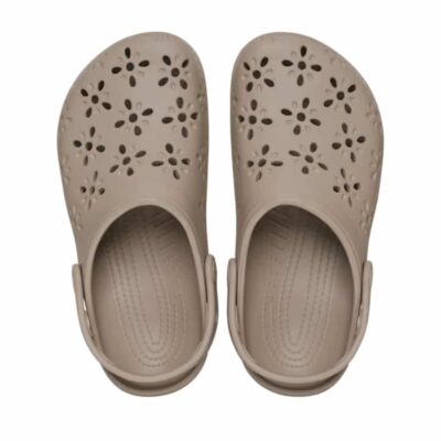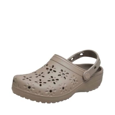 Crocs sandal til dame i brun. Denne klassiske Crocs sandal i en smuk brun farve får et feminint og friskt touch med blomsterinspirerede udskæringer, der tilføjer et livligt touch. Den praktiske hælrem gør det let at tage sandalerne på og af, og de karakteristiske huller sikrer god åndbarhed. Den robuste sål med et effektivt mønster forbedrer skridsikkerheden, så du kan gå sikkert hele dagen.