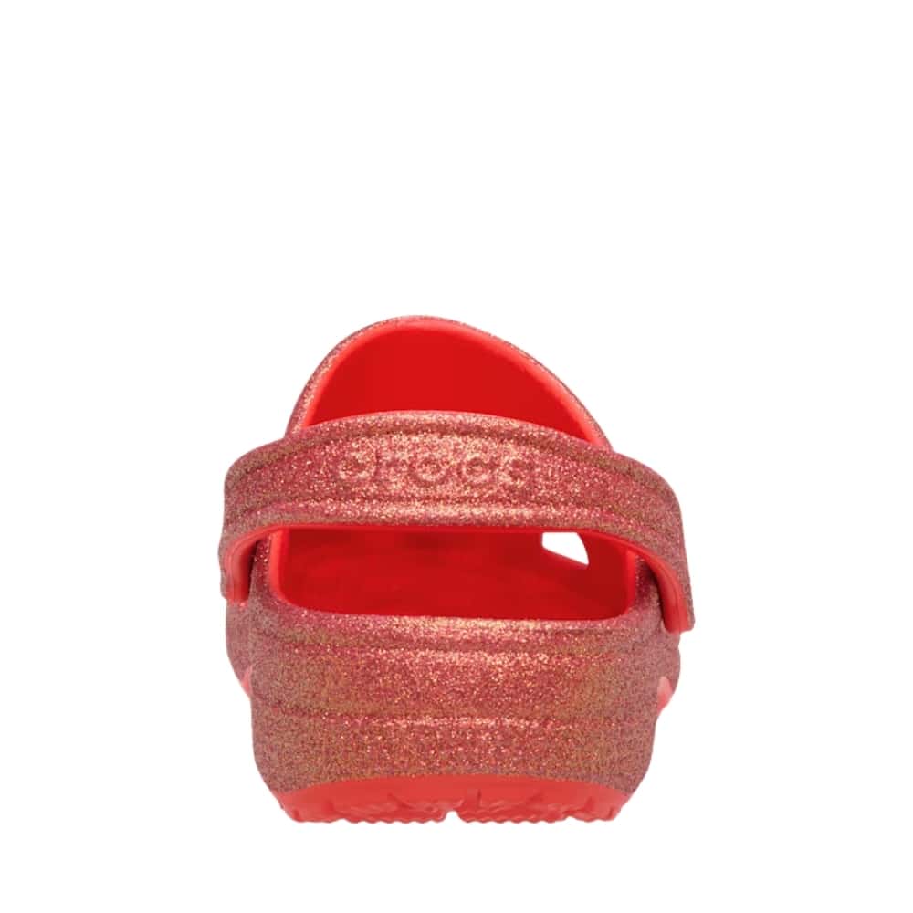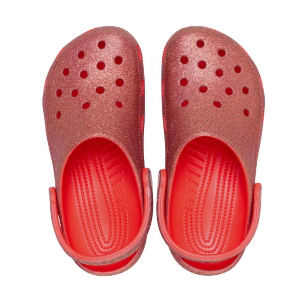 Crocs sandal til dame i rød glimmer. Disse Crocs kombinerer komfort med et festligt look. Den røde farve med glimmer giver et livligt udtryk, og det lette materiale gør dem behagelige at have på hele dagen. Slip-in designet gør det nemt at tage dem af og på, og de egner sig perfekt til varme dage og afslappende ferier.