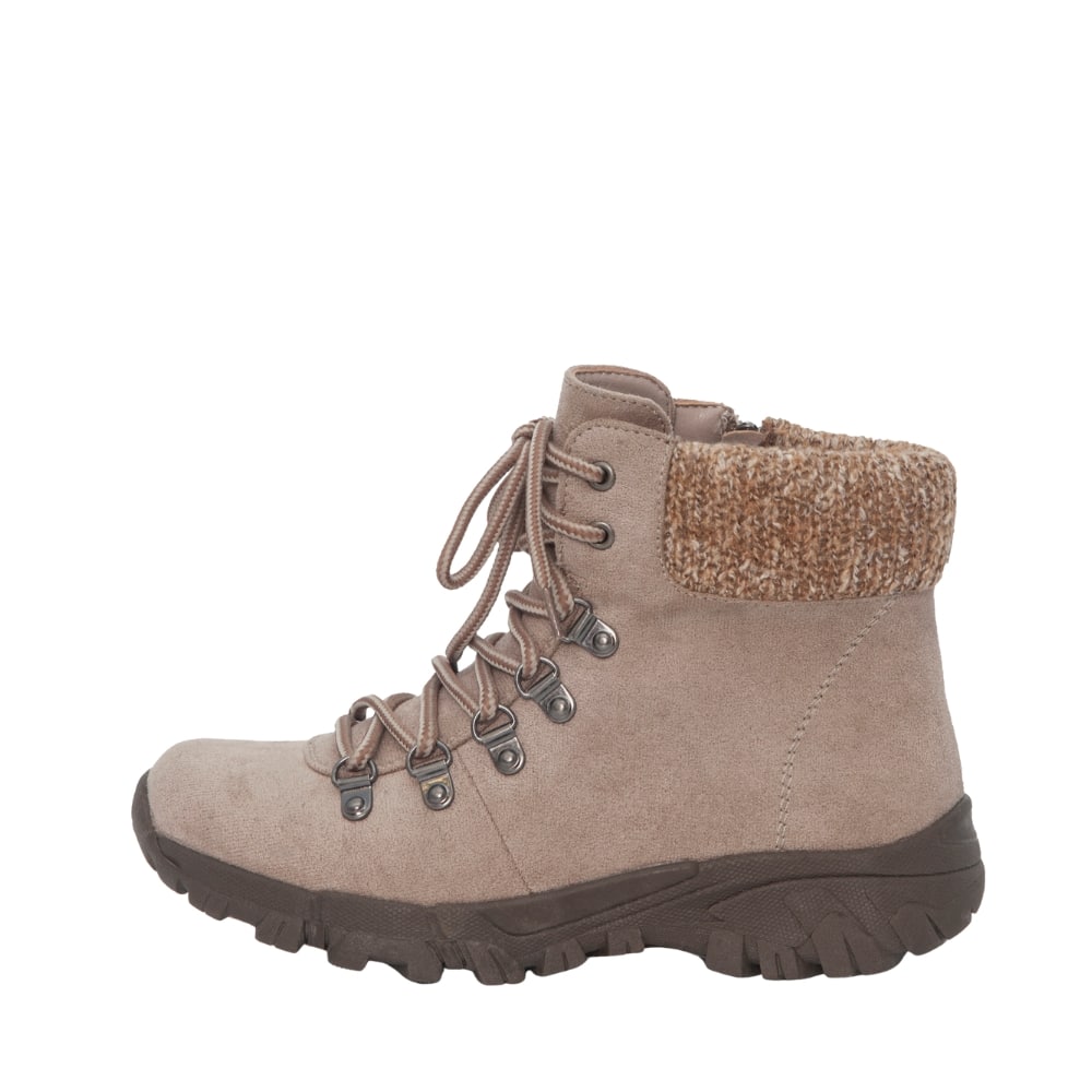 Duffy Ferla Uno støvle til dame i beige. Stilren og praktisk vinterstøvle i beige med en flot strikket kant ved skaftet, der tilfører et moderne touch. Støvlen har snørebånd foran for en justerbar pasform samt en funktionel lynlås på indersiden, så den er nem at komme i og af. Indvendigt finder du en blød indersål og en varm foring, der holder fødderne behageligt lune hele dagen. Den robuste ydersål med mønster giver god støtte og øget skridsikkerhed i hverdagen.