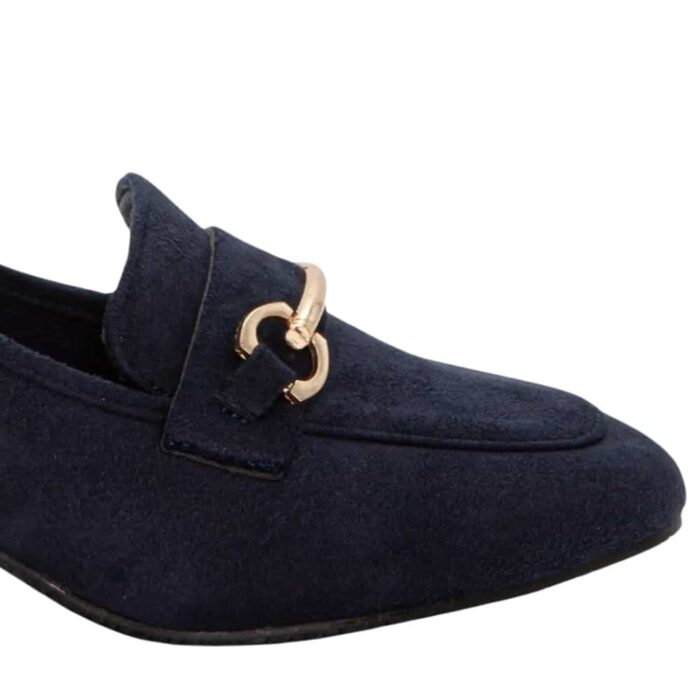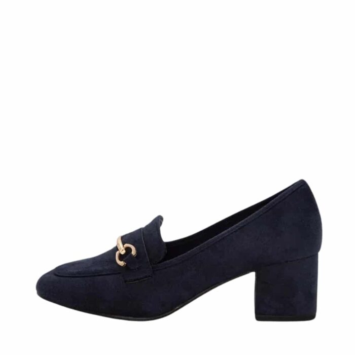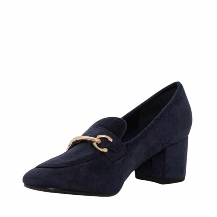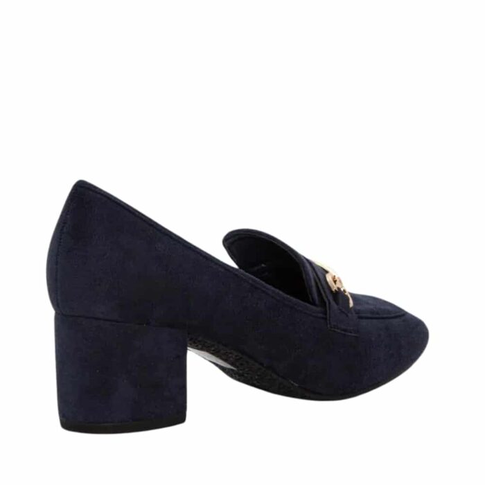 Duffy Giarre Quattro pumps til dame i mørkeblå. Stilfuld pump i imiteret ruskind og bløde såler, så du kan holde til at have dem på i lang tid. Modellen er i en flot navy/mørkeblå farve. Modeller er designet med et dekorativt guldspænde, der giver den et elegant udseende. Den 5,5 cm blokhæl er perfekt til både arbejde og mere festlige lejligheder. En trendy og frisk sko, der passer til alle aldre.