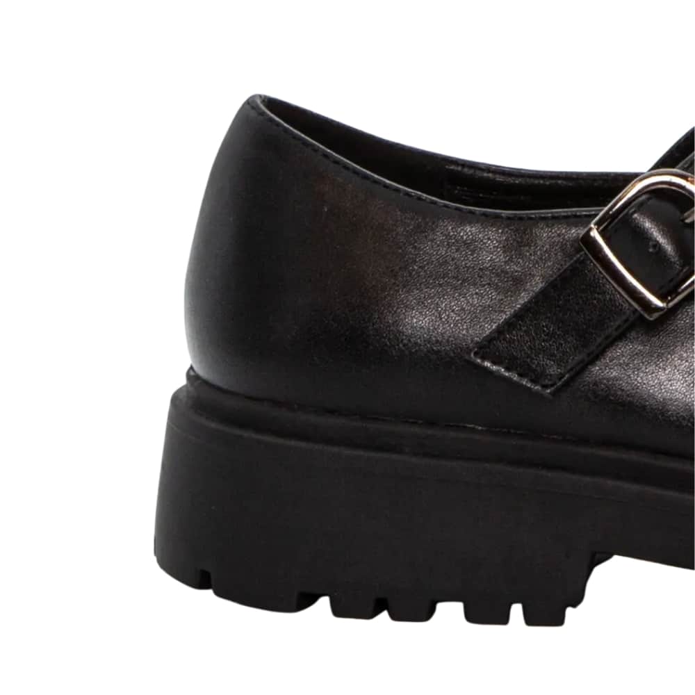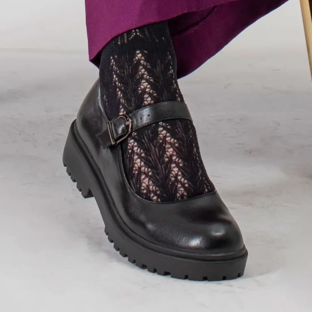 Duffy Lattarico Tre Mary Jane sko til dame i sort. Stilfuld sko i sort med et klassisk udtryk og et design. Den justerbare rem over vristen med spænde sikrer en god og justerbar pasform. Indvendigt er skoen udstyret med en blød indersål, der giver komfort dagen igennem. Den mønstrede ydersål og blokhælen på 4 cm giver et flot løft uden at på kompromis med komforten.