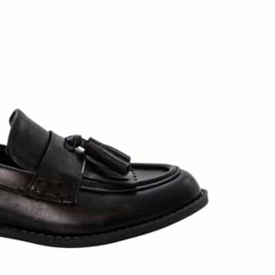 Duffy Pedalino Due loafers til dame i sort. Disse moderne loafers i sort kombinerer tidløst design med fine flæsedetaljer foran, som tilfører modellen et elegant udtryk. Den fleksible åbning gør skoen let at tage af og på og giver en god pasform. Indvendigt er skoen udstyret med en blød indersål for høj komfort, og hælen på cirka 2,5 cm giver et stilfuldt løft.