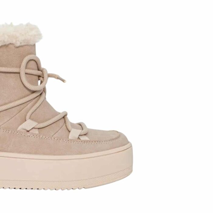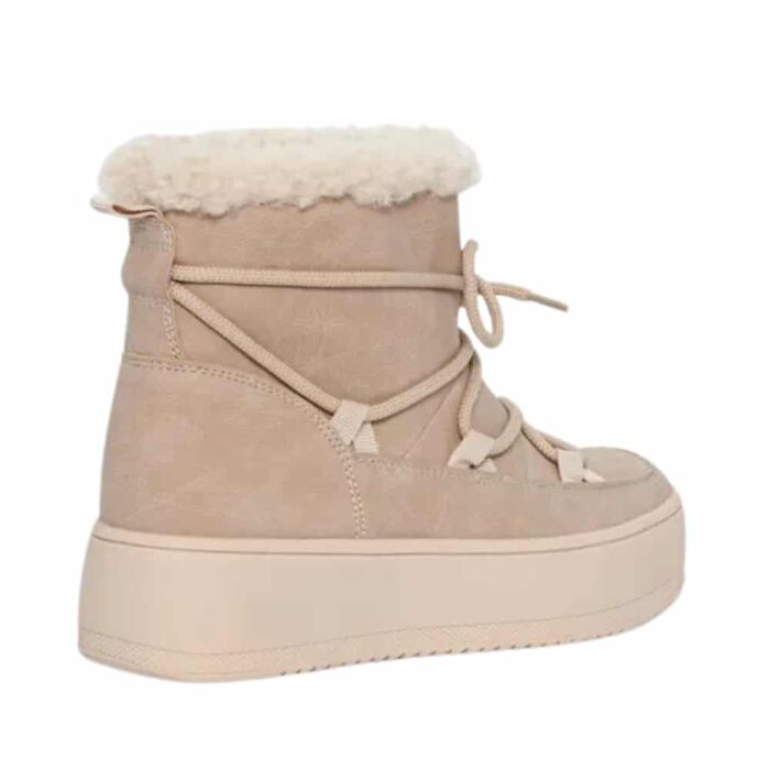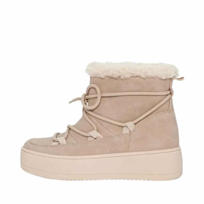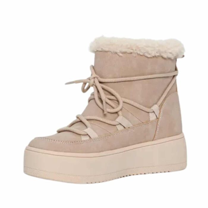 Duffy Riaci Due vinterstøvle til dame i beige. Denne varmforede støvle i kunstlæder er den perfekte kombination af stil og praktisk funktion. Den dekorative snøring på overdelen giver støvlen et moderne og elegant udtryk, mens den robuste gummisål sikrer godt greb på alle underlag. Indvendigt sørger den bløde syntetpels for at holde dine fødder varme og komfortable, selv på de koldeste vinterdage. En alsidig støvle, der både er ideel til hverdagsbrug og til vinterens udfordringer.