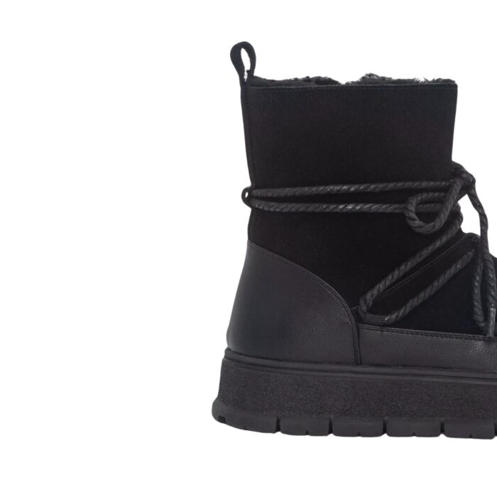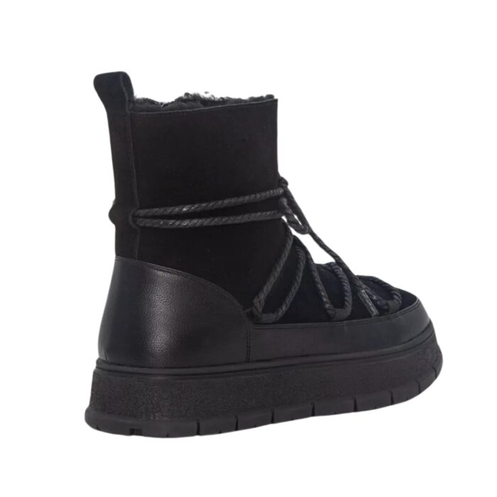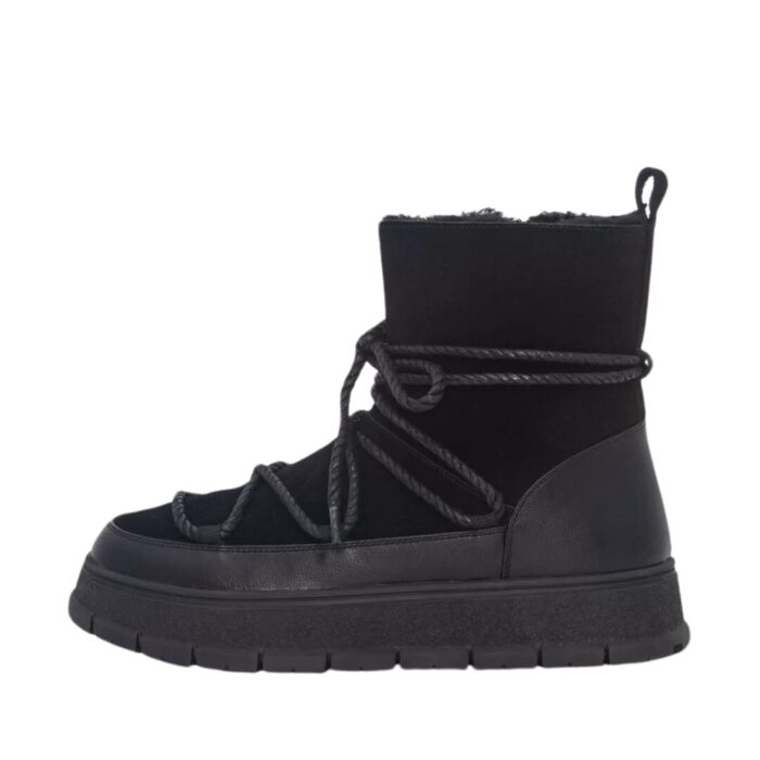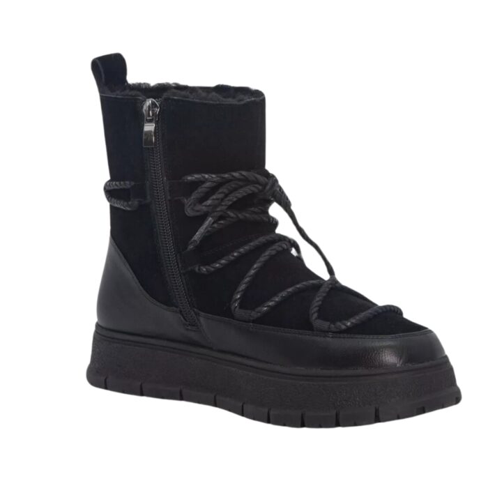 Duffy Delia Uno støvle til dame i sort. Opgrader din vinterstil med vores trendy varmforede støvler, der kombinerer imiteret læder og ægte ruskind for en perfekt balance mellem stil og komfort. Den moderne snøring og praktiske lynlås gør påklædningen let, mens det luksuriøse foer i kunstpels holder dine fødder varme og bløde. Støvlerne har en slidstærk gummisål for både stil og solidt fodfæste. Vandafvisende.