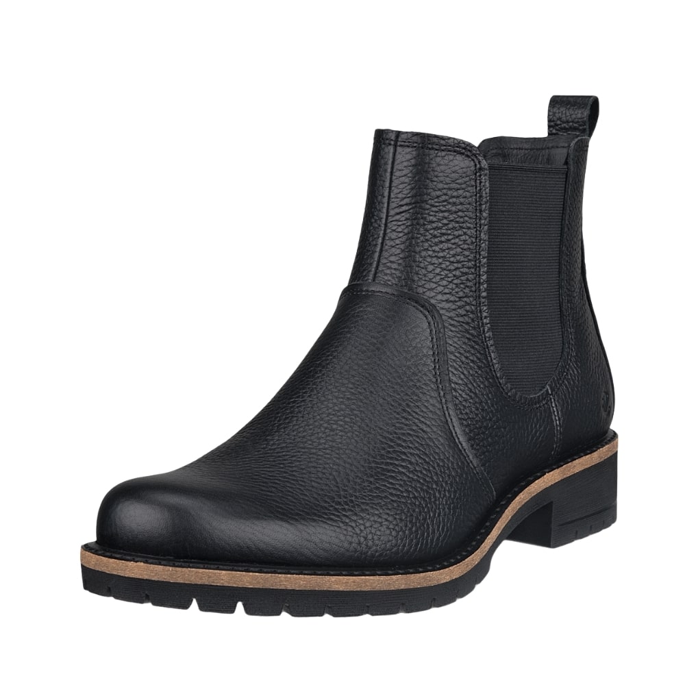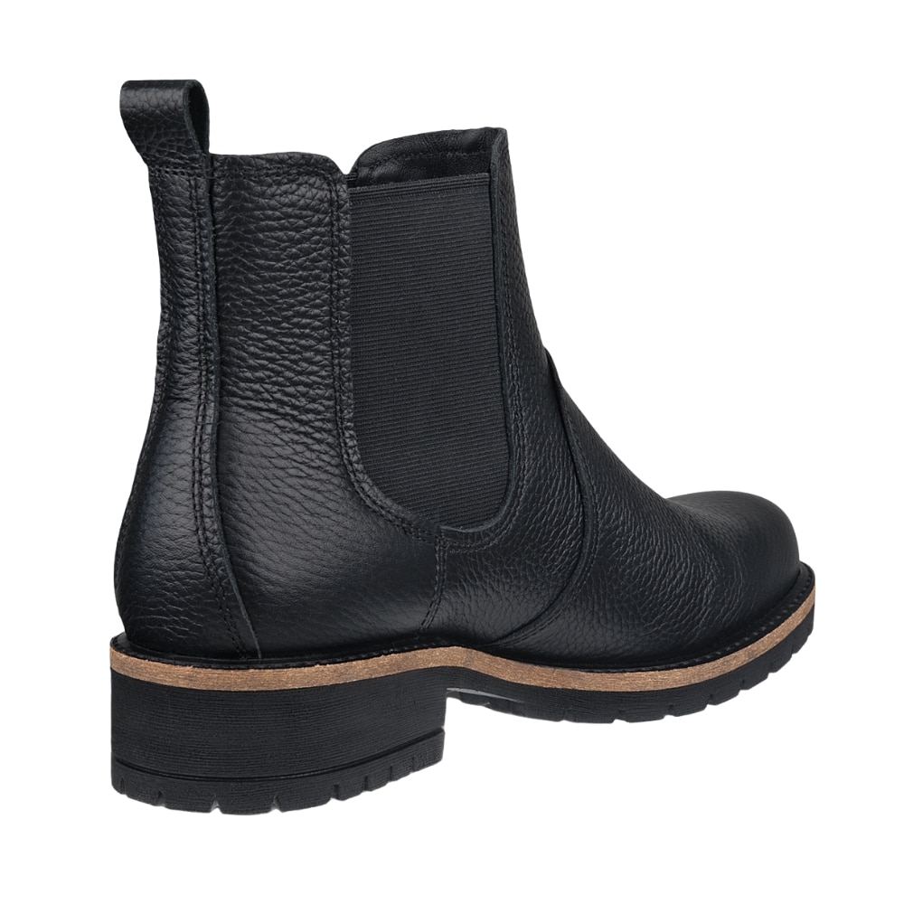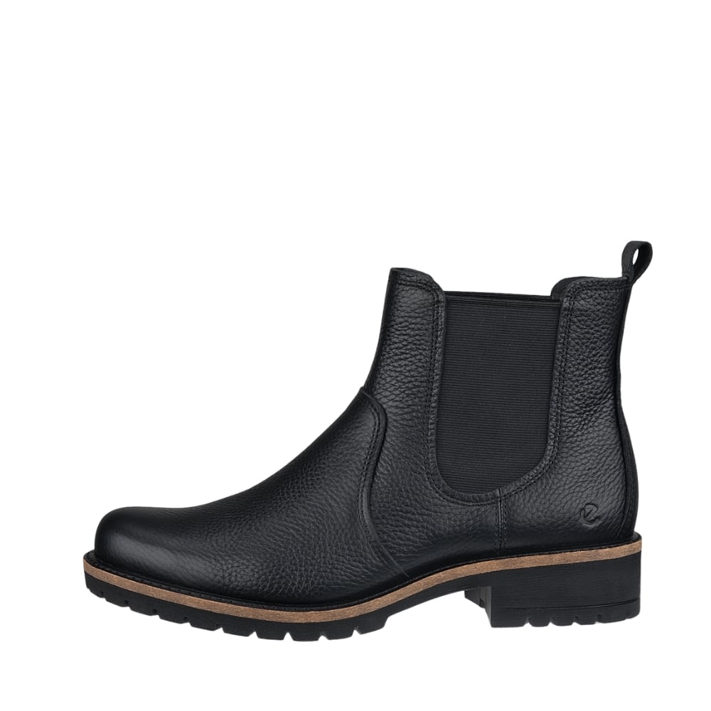 Ecco Elaina støvle til dame i sort. Stilfuld sort chelseastøvle i læder med et klassisk look og moderne detaljer. De elastiske paneler i siderne gør den nem at tage på, samtidig med at pasformen bliver fleksibel og behagelig. Indvendigt finder du en blød, udtagelig indersål, som giver god komfort, mens Ecco Fluidform™ teknologien tilpasser sig fodens naturlige bevægelser. Den robuste ydersål med blokhæl på ca. 4 cm og mønster giver både støtte og skridsikkerhed dagen igennem.