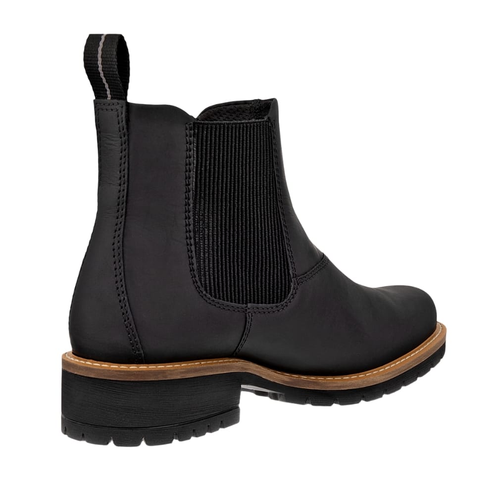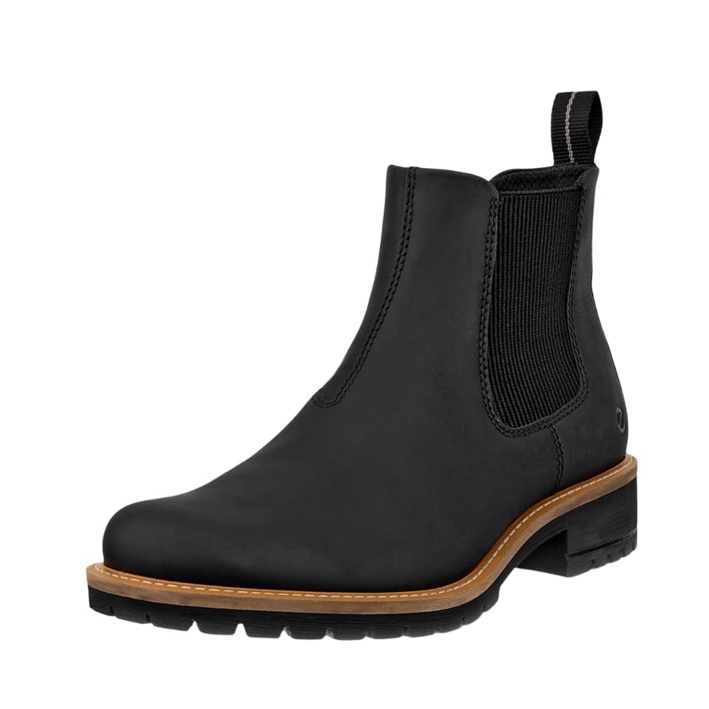 Ecco Elaina støvle til dame i sort. Elegant og moderne chelseastøvle i sort skind, skabt til både hverdag og finere brug. Støvlen er designet med elastik i begge sider, som giver en god pasform og gør den let at tage på. Indvendigt sørger en blød, udtagelig indersål for behagelig komfort dagen igennem. Den avancerede Ecco Fluidform™ teknologi gør støvlen fleksibel og støttende, mens den lille blokhæl på ca. 3,5 cm giver et flot løft. Støvlens ydersål er godt mønstret for øget skridsikkerhed og komfort dagen lang.