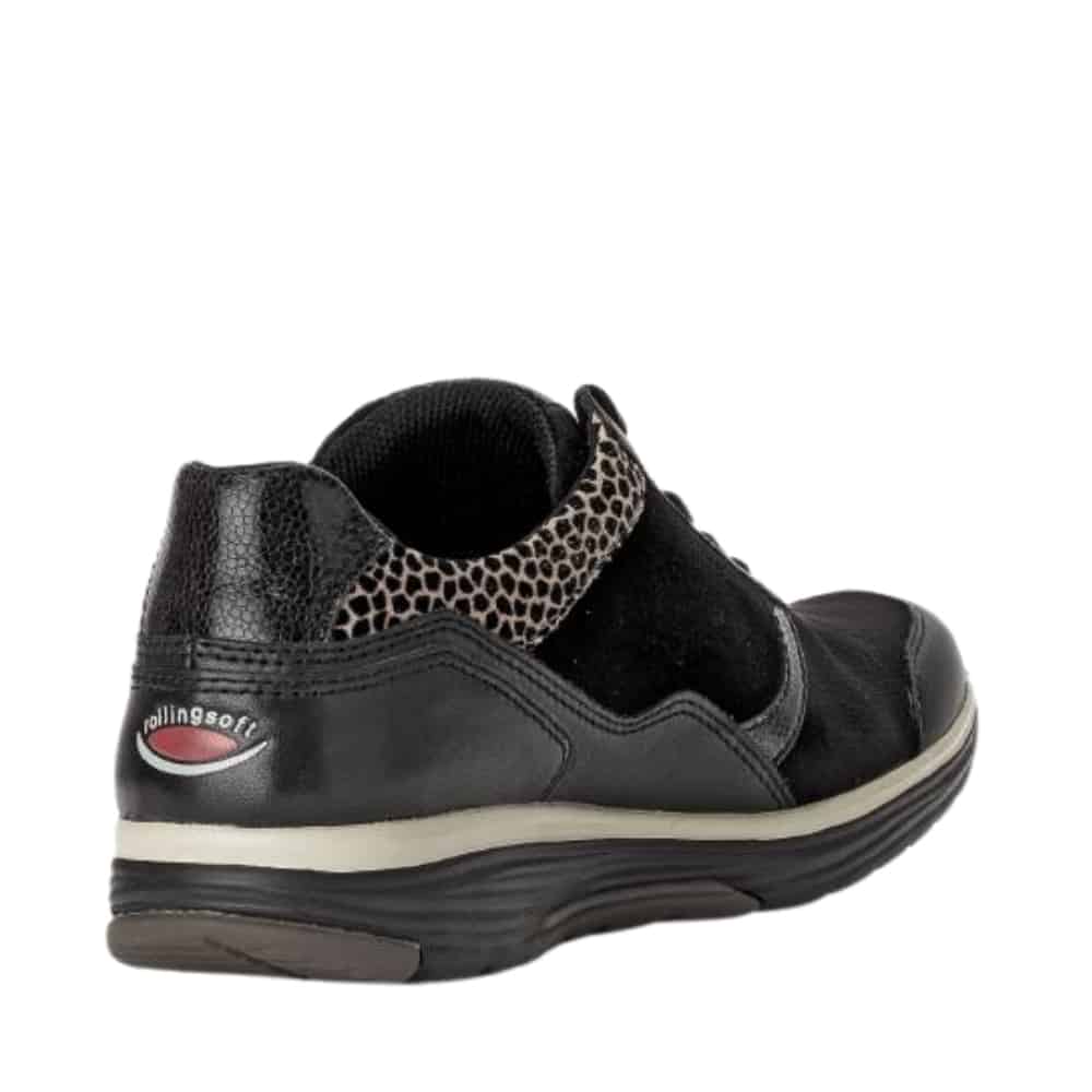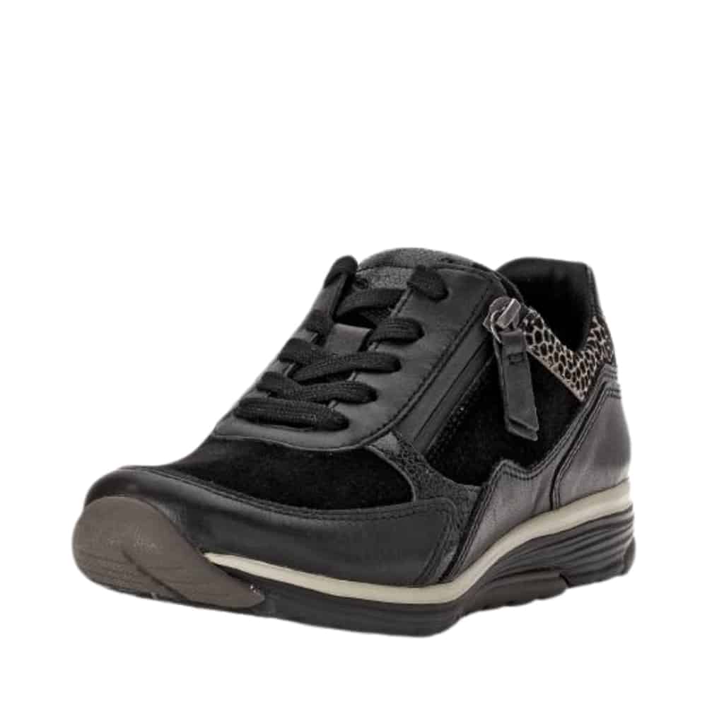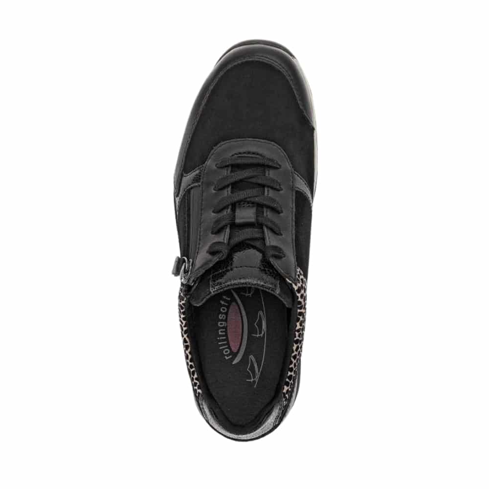Gabor Rollingsoft sneakers til dame i sort. Disse sneakers i sort kombinerer moderne stil med praktiske funktioner. Skinddetaljerne fremhæver designet, og den funktionelle lynlås på ydersiden gør det nemt at tage skoen af og på. Snørebåndene sikrer en pasform, der kan tilpasses dine behov. Indersålen er blød, udtagelig og udstyret med Rollingsoft teknologi, som støtter fodens naturlige bevægelser for øget komfort. Ydersålen er solid og har et mønster, der bidrager til både skridsikkerhed og stabilitet.