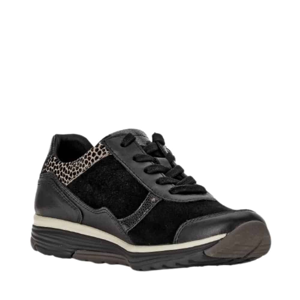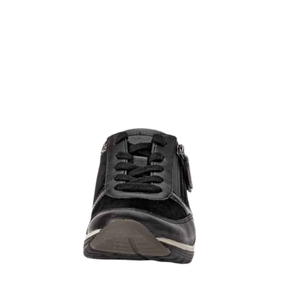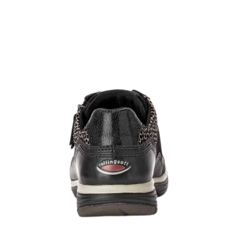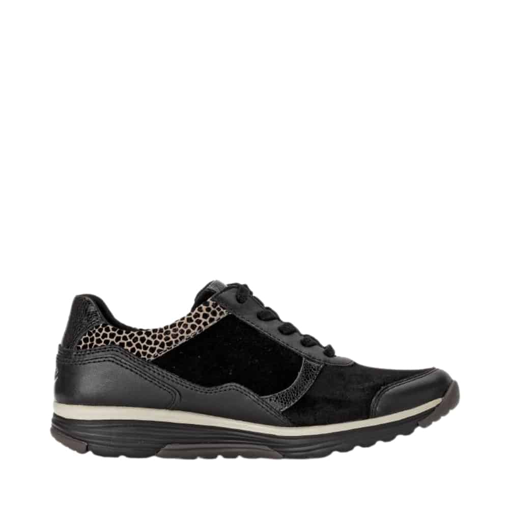 Gabor Rollingsoft sneakers til dame i sort. Disse sneakers i sort kombinerer moderne stil med praktiske funktioner. Skinddetaljerne fremhæver designet, og den funktionelle lynlås på ydersiden gør det nemt at tage skoen af og på. Snørebåndene sikrer en pasform, der kan tilpasses dine behov. Indersålen er blød, udtagelig og udstyret med Rollingsoft teknologi, som støtter fodens naturlige bevægelser for øget komfort. Ydersålen er solid og har et mønster, der bidrager til både skridsikkerhed og stabilitet.