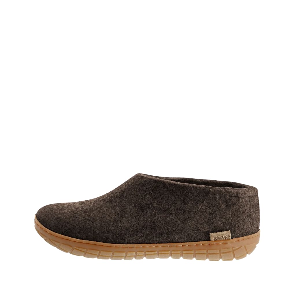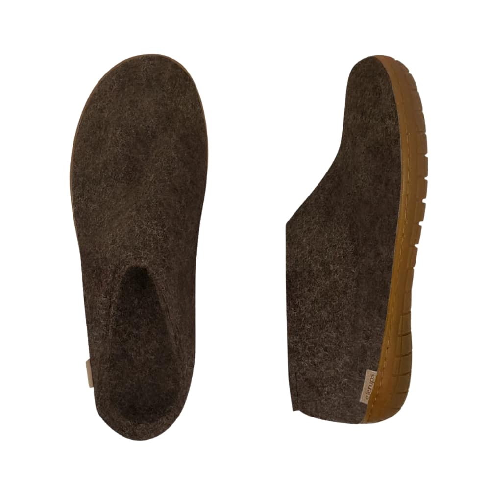 Glerups hjemmesko til dame og herre i brun. Flotte hjemmesko i 100% uld, som holder fødderne dejligt varme hele dagen. Den åbne hæl gør det let at tage hjemmeskoen af og på, og den bløde uld giver en behagelig fornemmelse. Modellen er udstyret med en gummisål, så du også kan bruge hjemmeskoen udendørs.