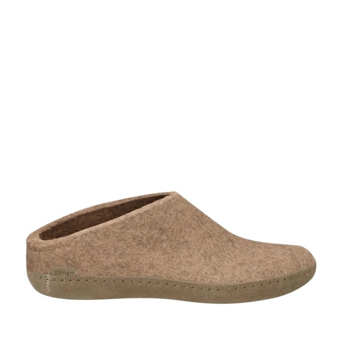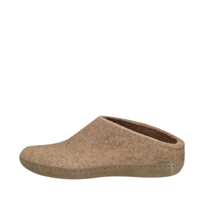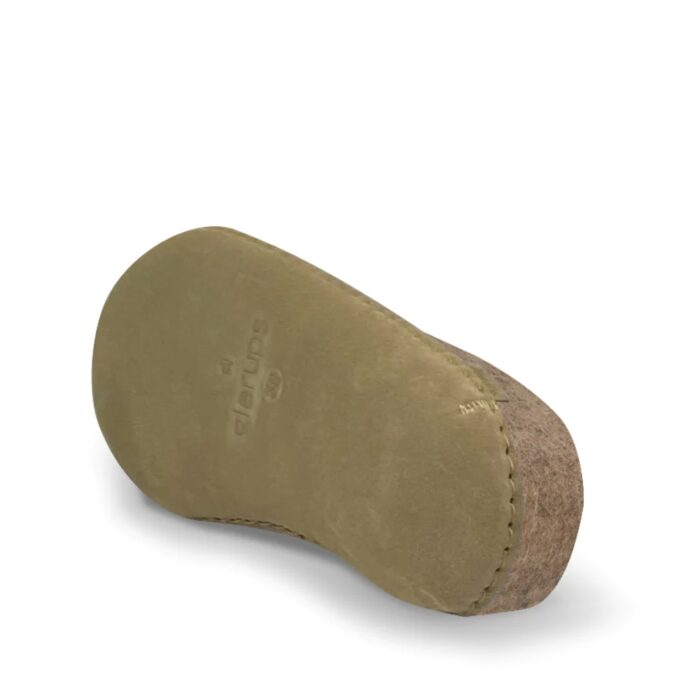 Glerups hjemmesko i sand farve til dame. Filt hjemmesko af 100% ren naturlig uld i den fineste blå/grønne farve. Modellen har en sål af semi-vegetabilsk garvet kalveskind. Hjemmeskoens pasform følger fodens konturer og søger for, at den forbliver på foden. Modellen er smidig, og uldens egenskab til at optage fugt bevirker, at fødderne altid føles varme og tørre.