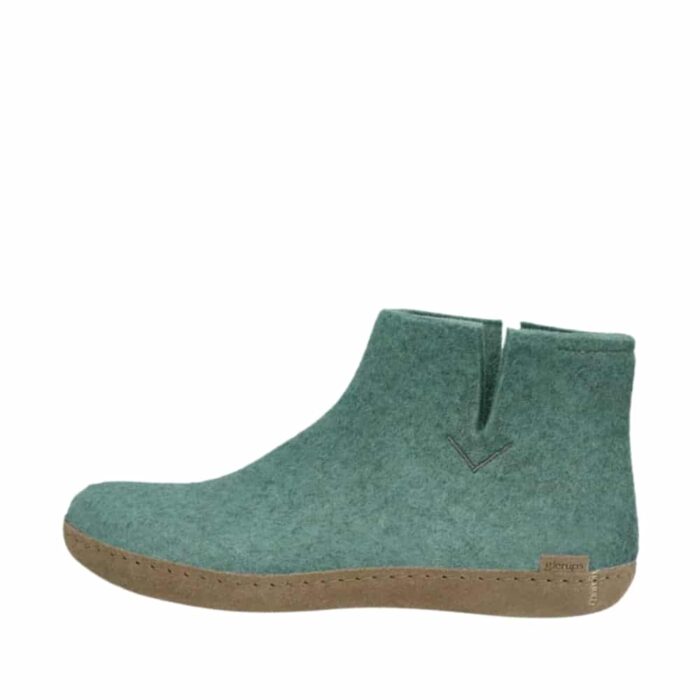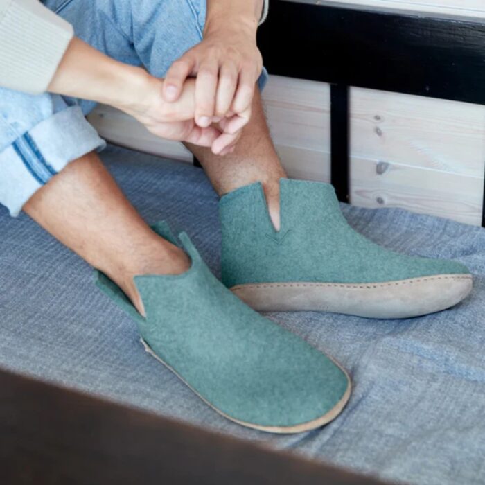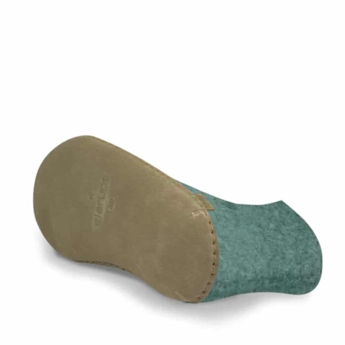 Glerups hjemmesko til dame i blå/grøn farve. En ankelstøvle i filt lavet af 100% ren naturlig uld i den nyeste farve, Sand, med en sål af semi-vegetabilsk garvet kalveskind. Denne hjemmesko byder på en komfortabel pasform, der omslutter foden tæt. Skaftet når lige over anklen. Hjemmeskoen er yderst fleksibel, og uldens evne til at absorbere fugt sikrer, at dine fødder altid forbliver varme og tørre.