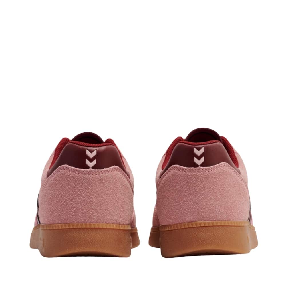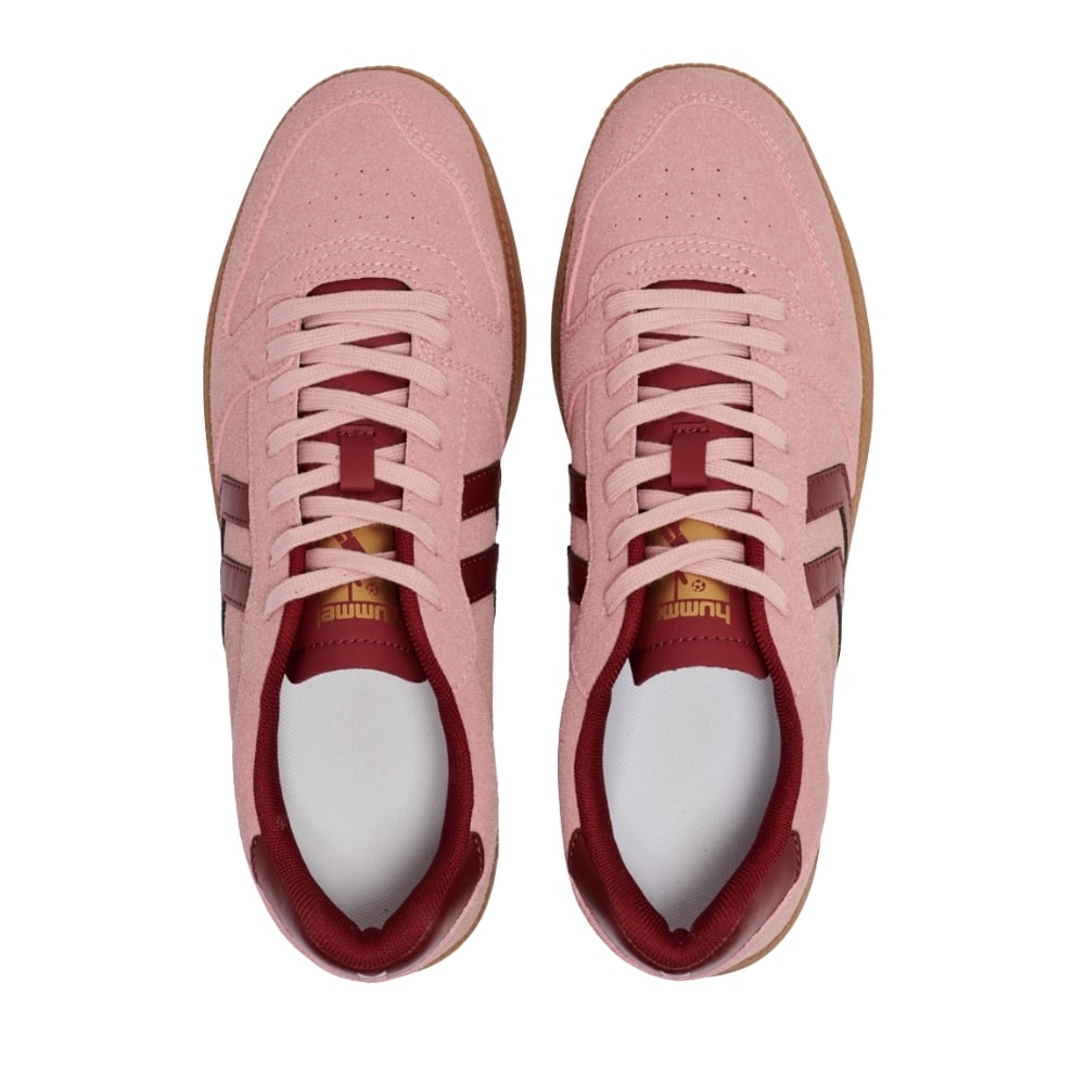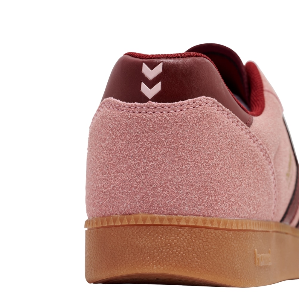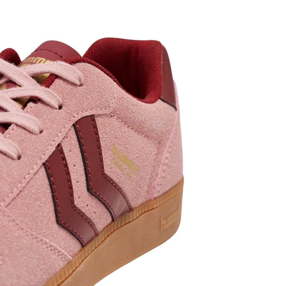 Hummel Handball Perfekt CL sneakers til dame i lyserød. Disse sneakers kombinerer et moderne design i lyserød med bordeauxfarvede Hummel vinkler for et friskt og sporty look. Snørebåndene foran gør det nemt at tilpasse pasformen og tage skoene af og på. Indersålen er blød og udtagelig, hvilket sikrer komfort dagen igennem. Skoen er udstyret med en let og fleksibel TPR ydersål, der giver øget støtte og god skridsikkerhed.