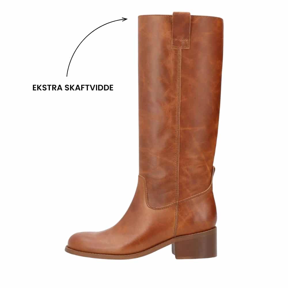 Phenumb Copenhagen Martina Wix lang støvle til dame i cognac. Denne moderne støvle er lavet med ekstra skaftvidde, der giver en behagelig pasform til dig med brede lægge. Fremstillet i 100% blødt kernelæder, som kun bliver smukkere med tiden og giver et elegant udtryk. Indvendigt finder du glatskind og en blød indersål, der sørger for komfort hele dagen. Den chunky hæl på 5 cm giver et let og behageligt løft, og med sit moderne design og nemme påtagning passer støvlen perfekt til både hverdag og fest.