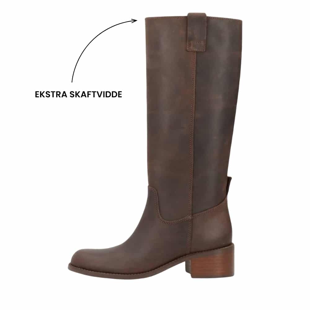 Phenumb Copenhagen Martina Wix lang støvle til dame i mørkebrun. Flot og moderne støvle med ekstra skaftvidde, der giver en komfortabel pasform til dig med brede lægge. Støvlen er lavet i 100% blødt kernelæder, som kun bliver pænere med tiden og tilfører et stilfuldt udtryk. Indvendigt mødes du af glatskind og en blød indersål, der giver god komfort gennem dagen. Den chunky hæl på 5 cm giver et elegant og stabilt løft, mens det moderne design gør støvlen let at kombinere med mange outfits.