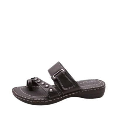 Relaxshoe sandal til dame i sort. Elegant sandal i sort med moderne detaljer, der giver et stilfuldt look. Sandalen er lavet af 100% skind og har en tårem med sølvnitter, der både sikrer pasform og et pænt udseende. Indvendigt blive du mødt af en dejlig blød sål, der giver øget komfort. Den justerbare velcrorem giver mulighed for at tilpasse pasformen, mens slip-in funktionen gør det nemt at tage sandalen på og af. En lille hæl på ca. 3,5 cm giver et elegant løft, samtidig med at den skridsikre sål sikrer komfort og stabilitet.