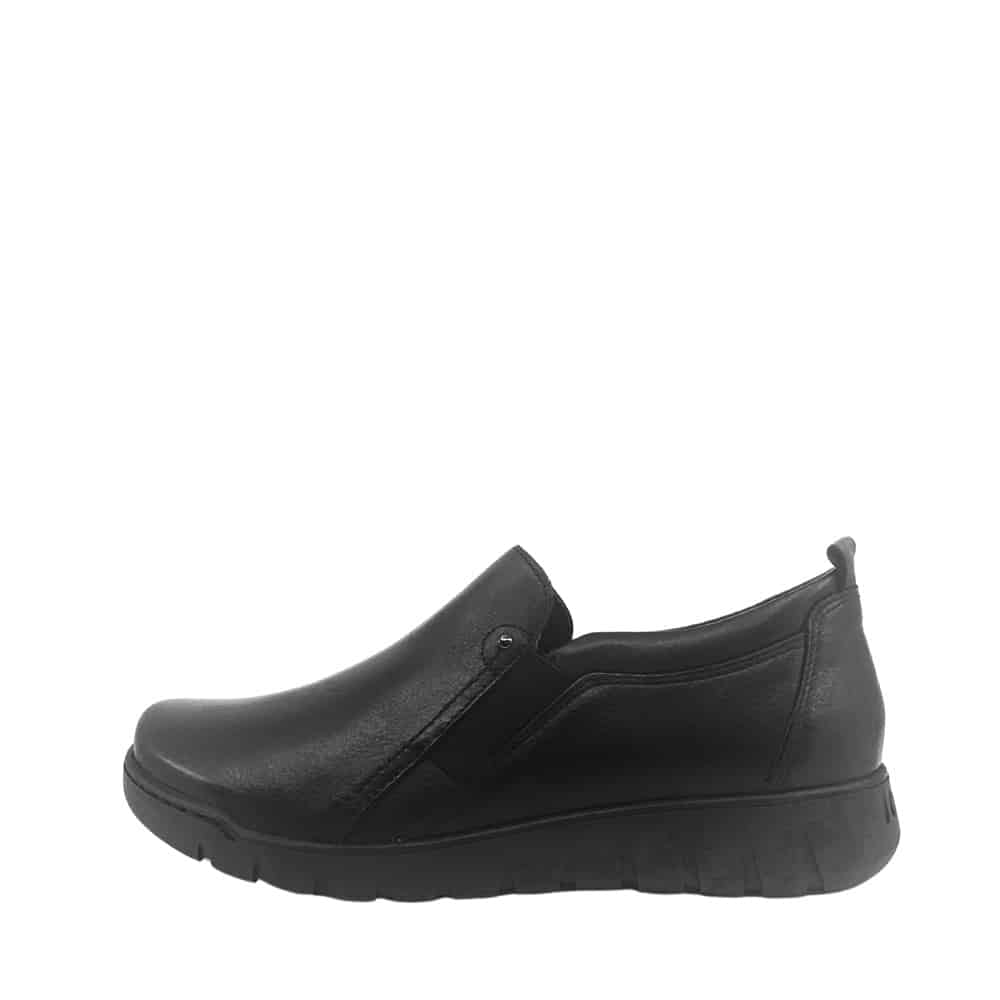 Relaxshoe sko til dame i sort skind med lynlås og elastik samt udtagelig skindsål samt lille kilehæl