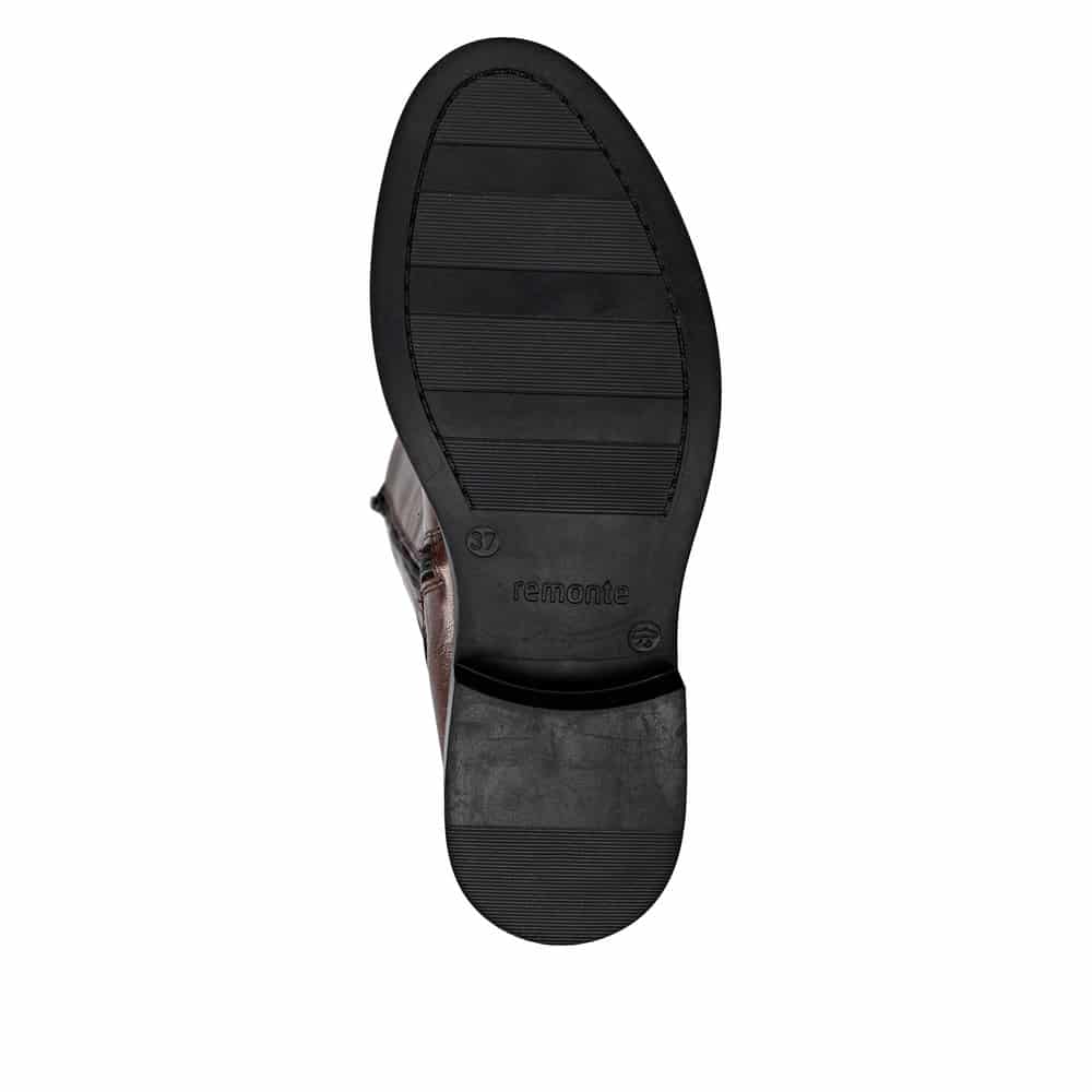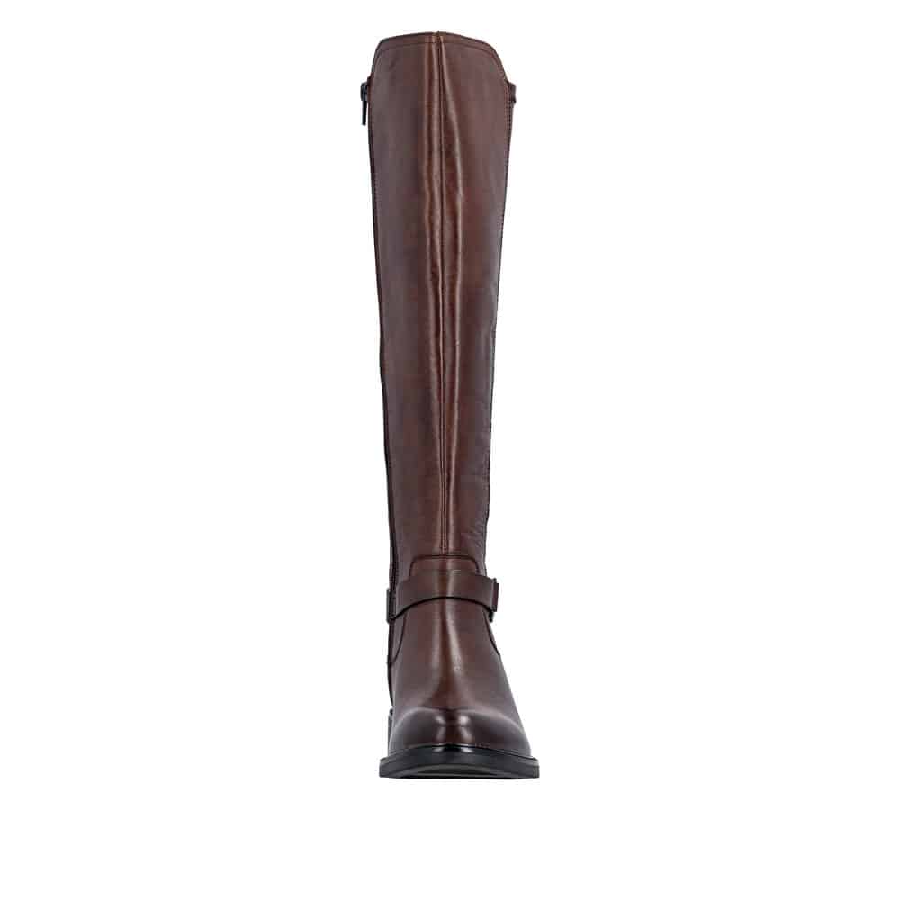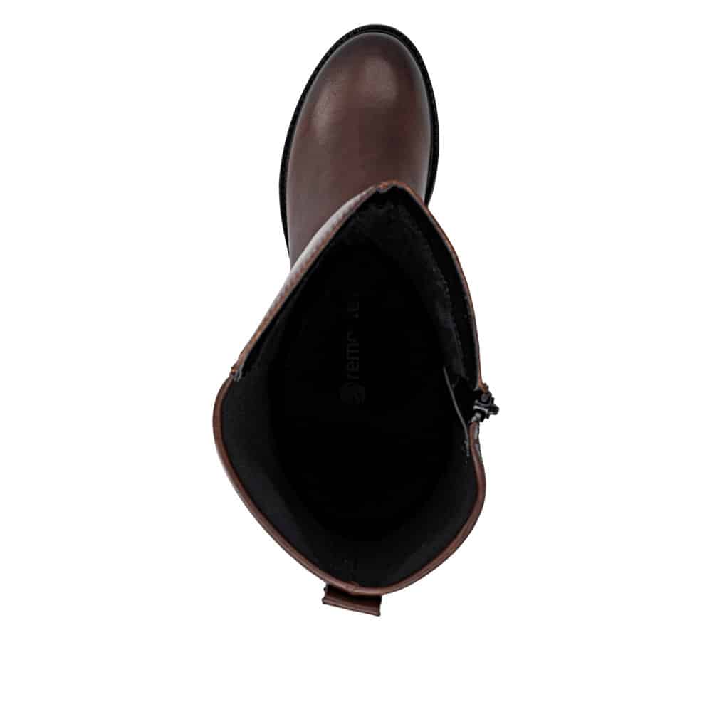Remonte lang støvle til dame i brun. Flot støvle i brun skind med langt skaft og en diskret detalje på siden, der understreger det elegante design. Støvlen har en funktionel lynlås på indersiden, så den er let at komme i. Indvendigt mødes du af en blød udtagelig sål og en let foring, som giver komfort hele dagen. Den lille blokhæl på ca. 3,5 cm giver et elegant løft og en behagelig balance mellem stil og komfort.