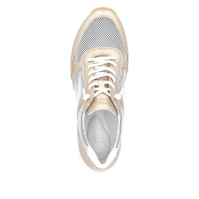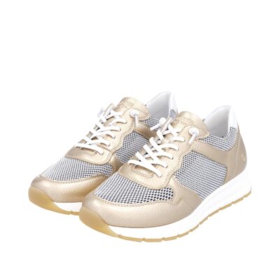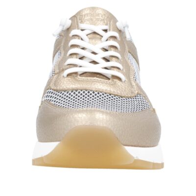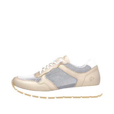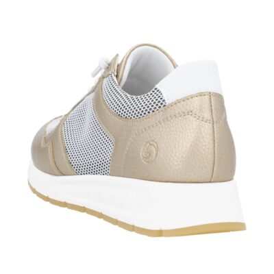 Remonte sneakers til dame i metallic guld. Remonte leverer her en sneaker, der emmer af både stil og funktionalitet. Det elegante guldfinish kombineres med åndbare meshdetaljer, og indersålen i Remonte Soft kan nemt tages ud eller skiftes. Ydersålen i gummi giver et godt greb og gør skoen ideel til både arbejde og fritid.