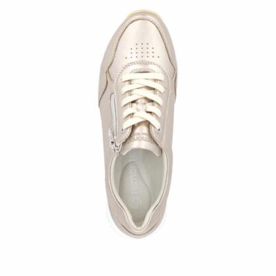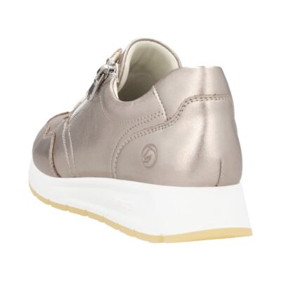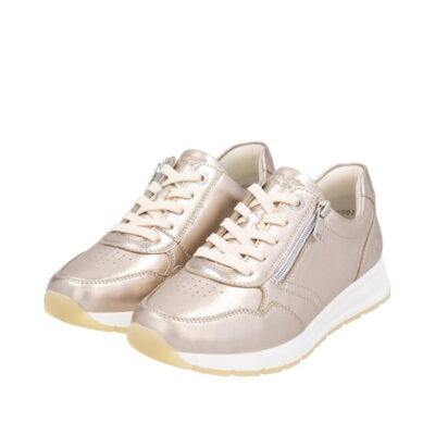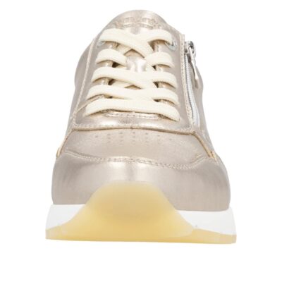 Remonte sneakers til dame i flot metallic farve. Med denne metallic Remonte dame sneakers får du både komfort og et trendy design. Den glatte skindoverdel med metallisk glans giver et moderne look, mens snørebånd og lynlås kombineres for optimal pasform og funktionalitet. Den let forhøjede kilehæl giver støtte og et feminint løft, mens den lette og fleksible Light TR-sål sørger for en behagelig gang. Den udtagelige soft indersål giver ekstra polstring, så du kan gå komfortabelt hele dagen. Perfekt til både afslappede og mere formelle outfits, er denne sneakers et godt valg til kvinder, der ønsker en stilfuld hverdagssko med et moderne twist.