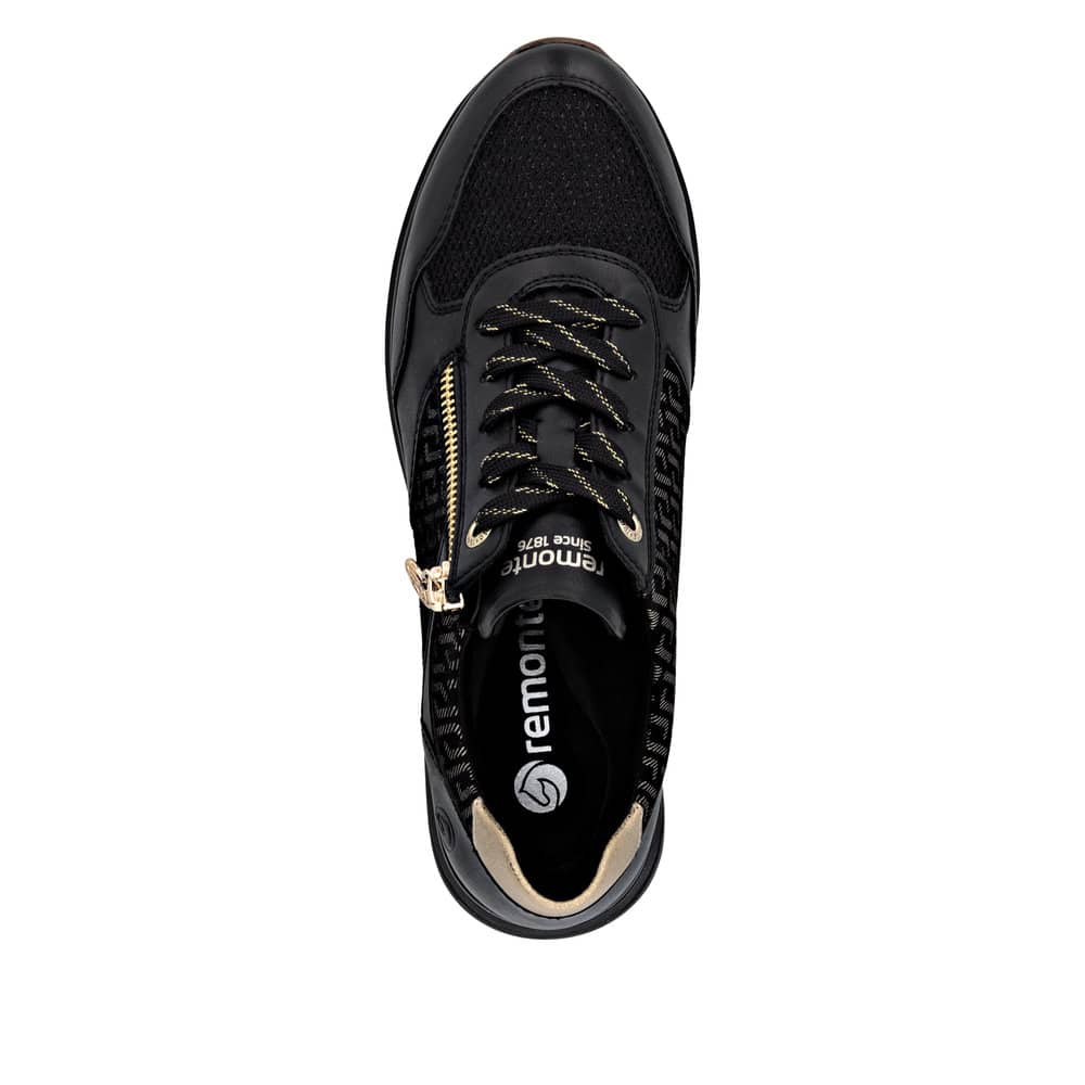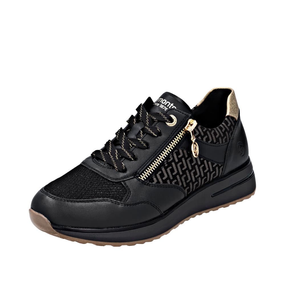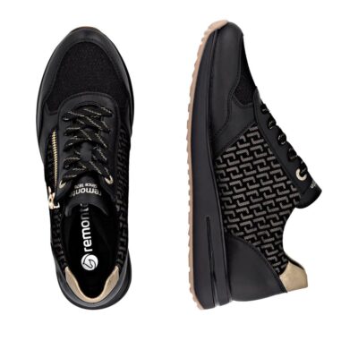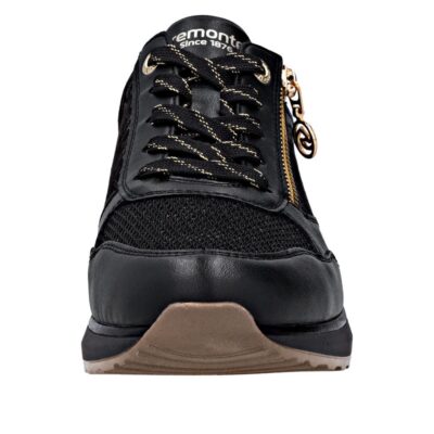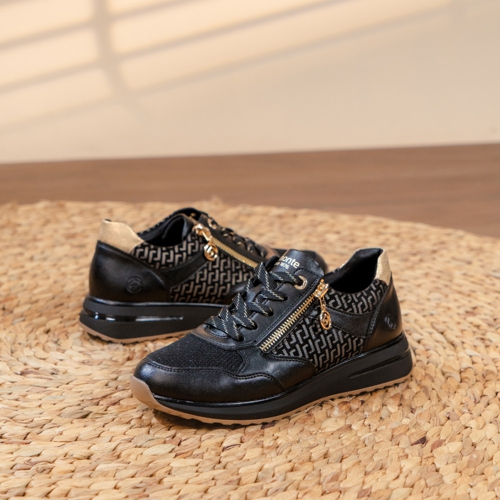 Remonte sneakers til dame i sort. Stilfulde sneakers i sort med fine gulddetaljer, der giver et feminint og moderne udtryk. Skoen er udstyret med snørebånd og lynlås, som tilpasser sig din fod og gør det nemt at tage skoen på. Indersålen er blød og komfortabel takket være indersålen som er Remonte-Soft. Den mønstrede, fleksible ydersål giver både øget stødabsorbering og skridsikkerhed, så du kan få komfort hele dagen.