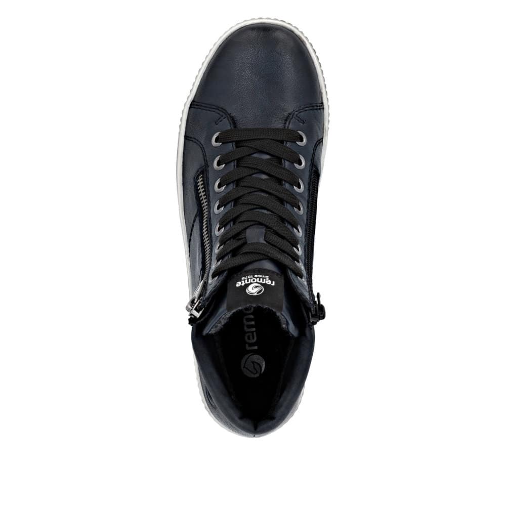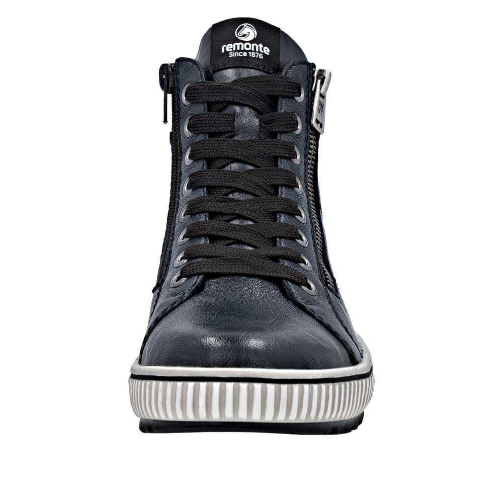 Remonte støvle til dame i mørkeblå skind med to funktionelle lynlåse og udtagelig sål med ekstra bredde G og Remonte-Tex