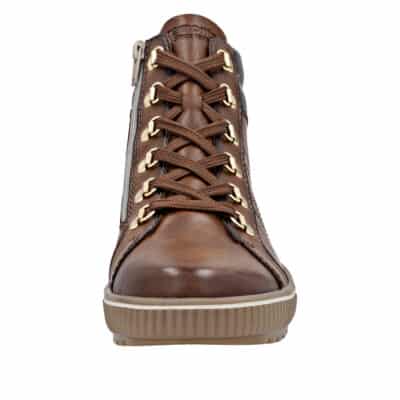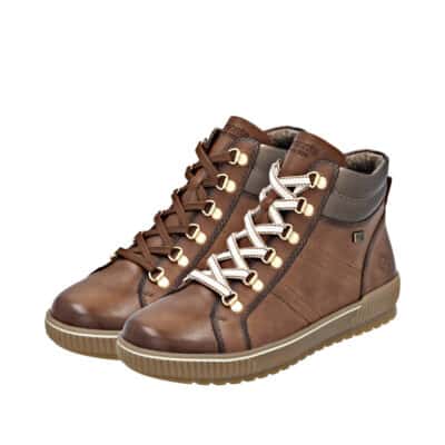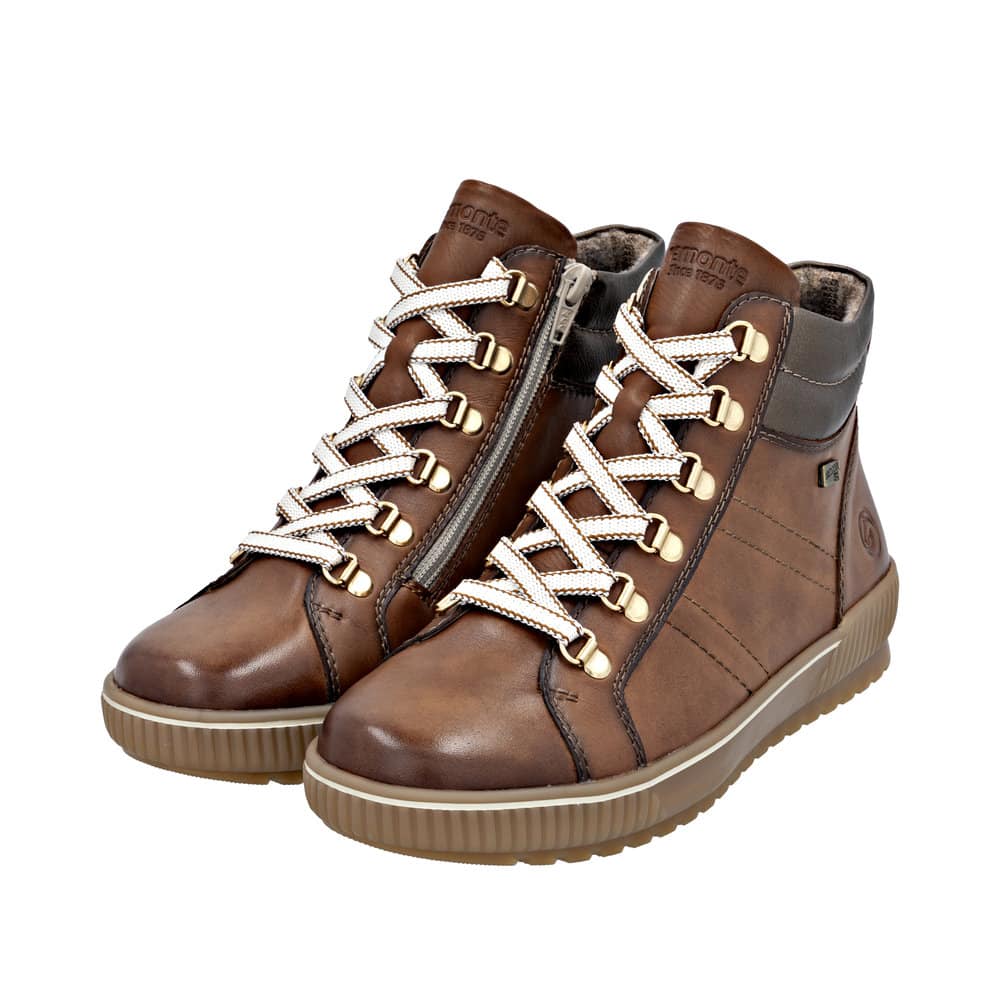 Remonte støvle til dame i brun. Denne brune støvle giver dig både et stilfuldt look og en behagelig pasform. Skindoverdelen kombineres med snørebånd der kan skiftes og en lynlås på indersiden, så du nemt kan tage støvlen af og på. Indvendigt er den udstyret med en udtagelig Remonte Soft sål, der giver god komfort hele dagen, mens Remonte-Tex sørger for kraftig vandafvisning. Med ekstra bredde G får foden mere plads, og den solide mønstrede ydersål giver øget skridsikkerhed og effektiv stødabsorbering.