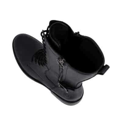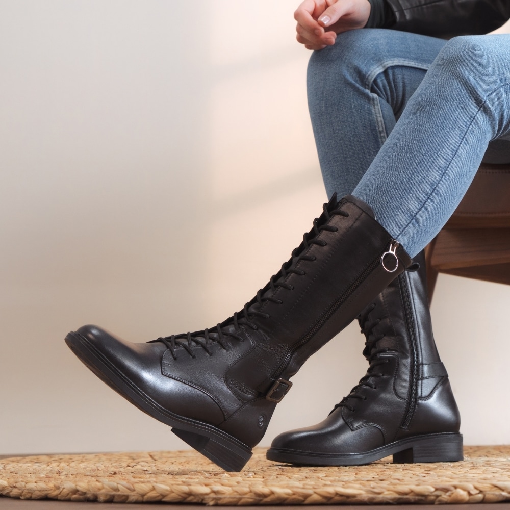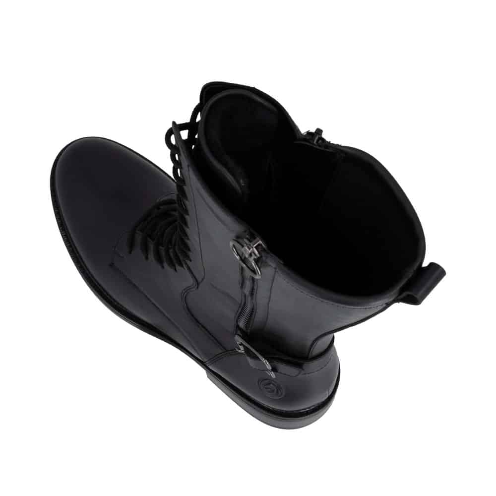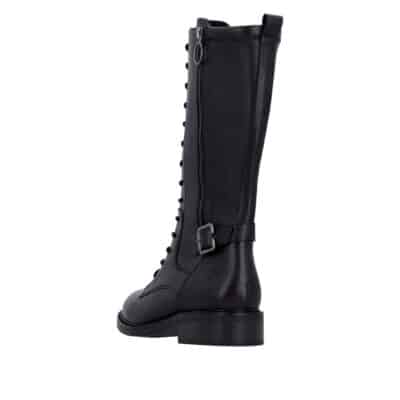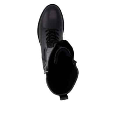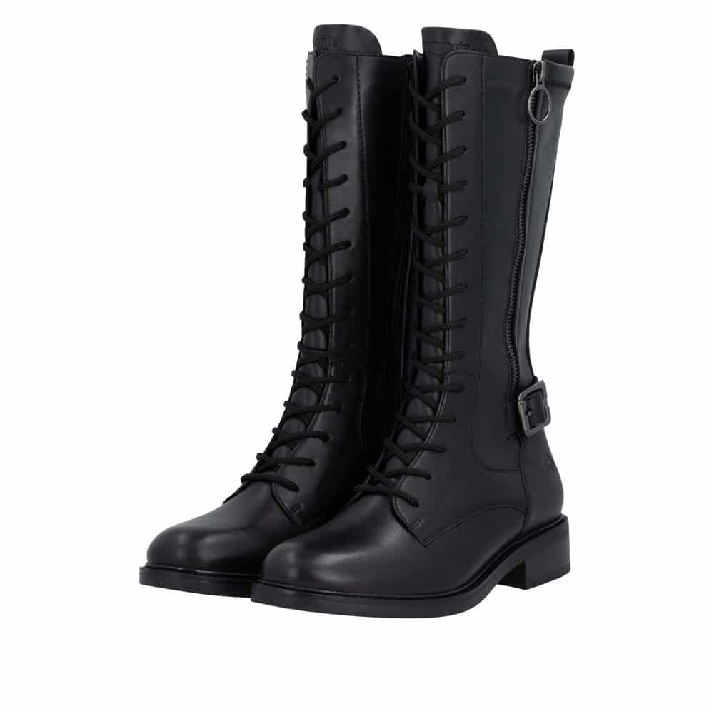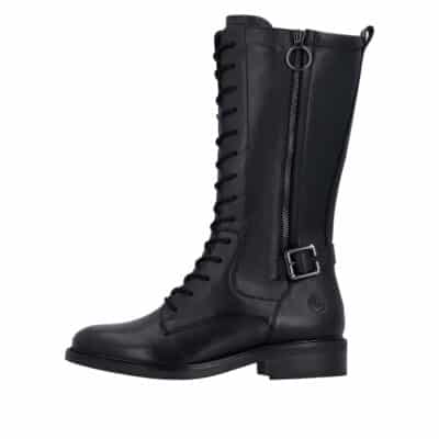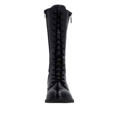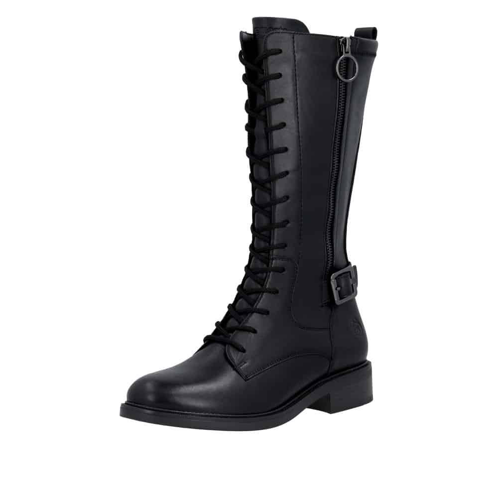 Remonte støvle til dame i sort. Flot og moderne støvle i sort skind med pynte lynlås og spænde på siden samt mellemlangt skaft, der understreger det stilfulde design. Snørebåndene foran gør det muligt at tilpasse pasformen, mens lynlåsen på indersiden gør støvlen praktisk at tage af og på. Indvendigt er den udstyret med en let foring og en blød, udtagelig Remonte-Soft sål, som giver maksimal komfort. Med en blokhæl på ca. 3,5 cm får du et elegant løft, uden at det går ud over den behagelige pasform.