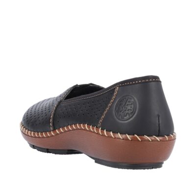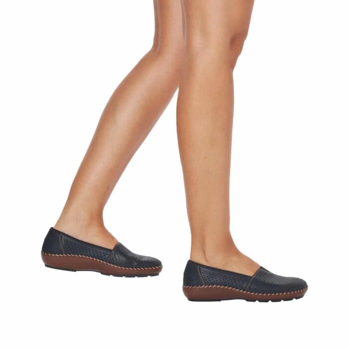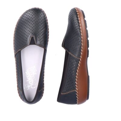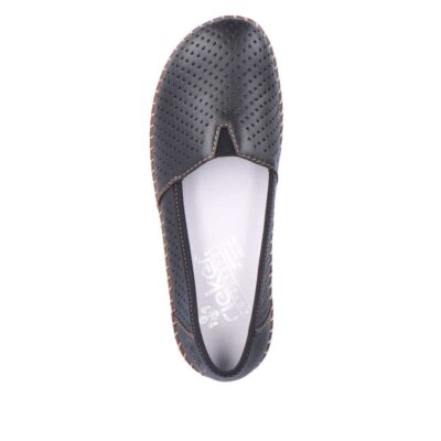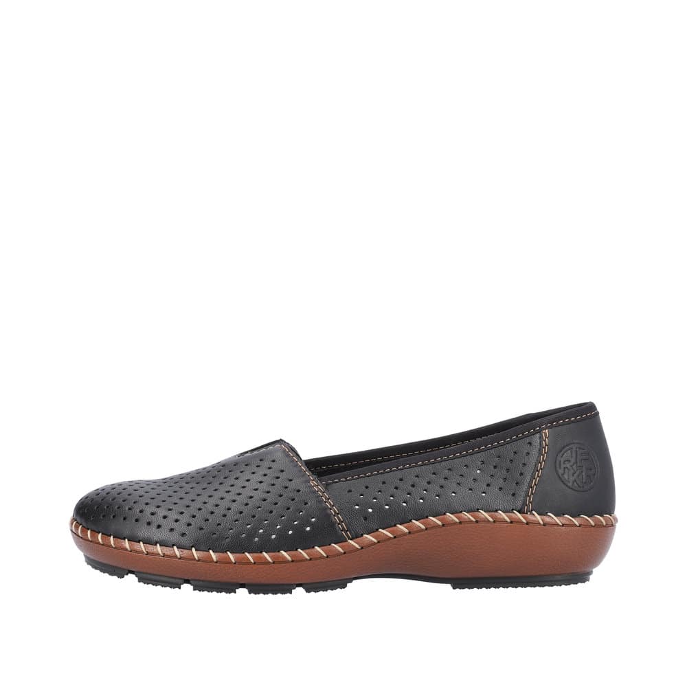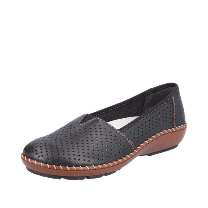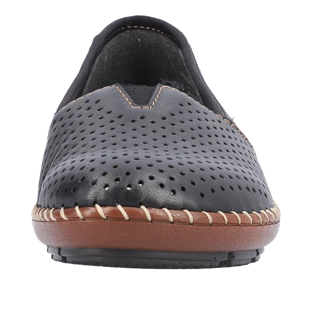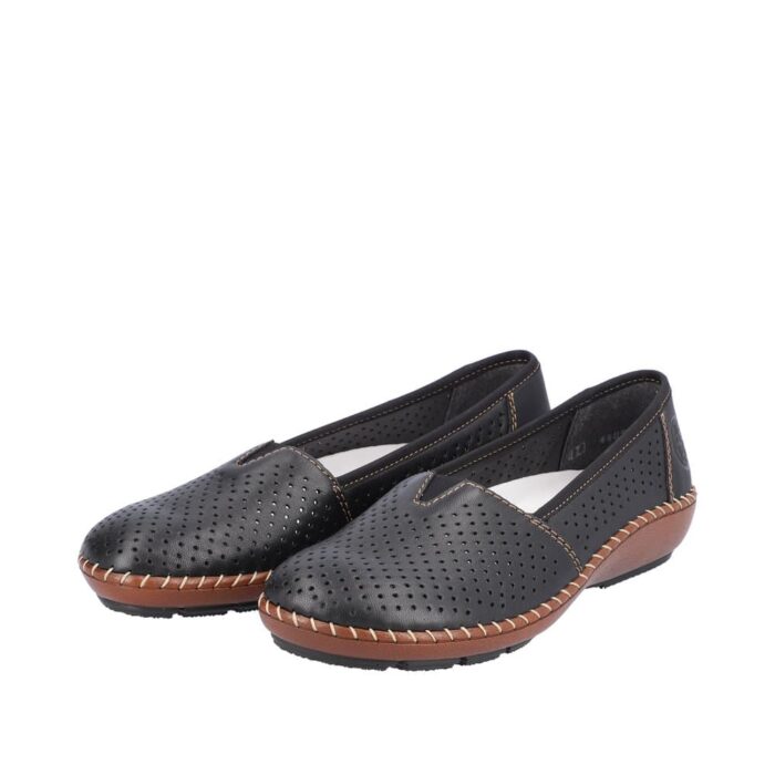 Rieker ballerinasko til dame i sort. Stilfuld sort ballerinasko med perforerede detaljer, der kombinerer mode og funktionalitet. Den bløde skindoverdel gør skoen let og behagelig at have på, mens elastikken foran sikrer en god pasform. Indersålen i blødt skind giver ekstra komfort, så du kan have skoen på hele dagen. Ydersålen er fleksibel og udstyret med stødabsorberende teknologi for øget støtte.