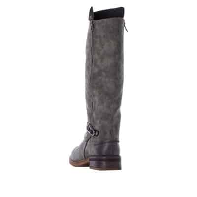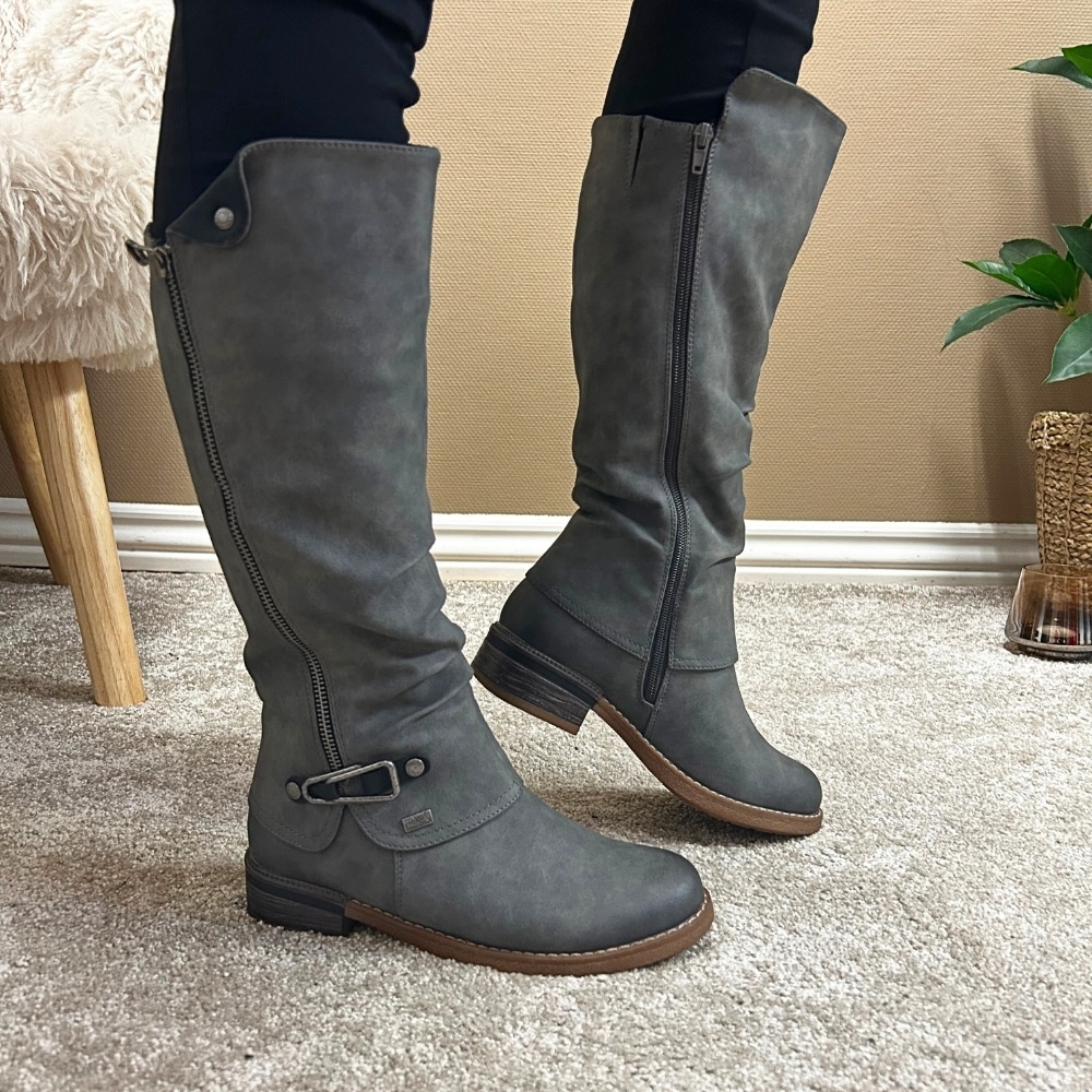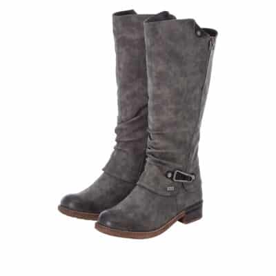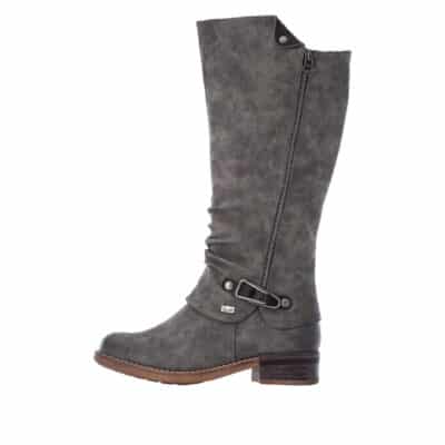 Rieker lang støvle til dame i grå. Elegant grå vinterstøvle med et klassisk udtryk og moderne detaljer. Den praktiske lynlås på indersiden gør det let at tage støvlen på, mens lynlåsen på ydersiden kan lynes en smule ned for at give mere plads. Indvendigt finder du en varm foring, der holder fødderne dejligt varme, samt en blød indersål, der giver komfort hele dagen. Med Rieker-Tex får du en støvle, der er kraftigt vandafvisende, mens den mønstrede ydersål giver god stødabsorbering og øget skridsikkerhed.