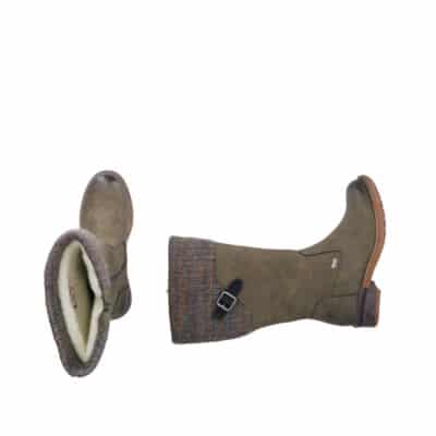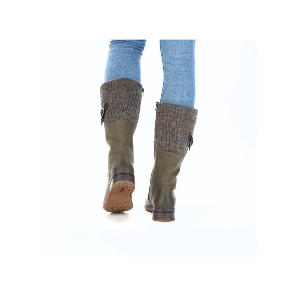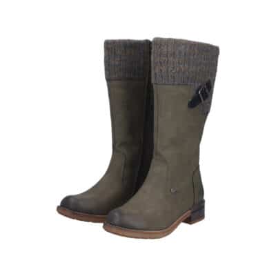 Rieker lang støvle til dame i grøn. Stilfuld vinterstøvle i en flot grøn farve med moderne detaljer. Den strikkede krave og spænden giver et smart udtryk, og lynlåsen på indersiden gør støvlen nem at tage af og på. Indvendigt er den udstyret med en varm foring og en blød indersål, der giver høj komfort. Rieker-Tex gør støvlen kraftig vandafvisende, og den stødabsorberende ydersål med mønster giver øget skridsikkerhed.