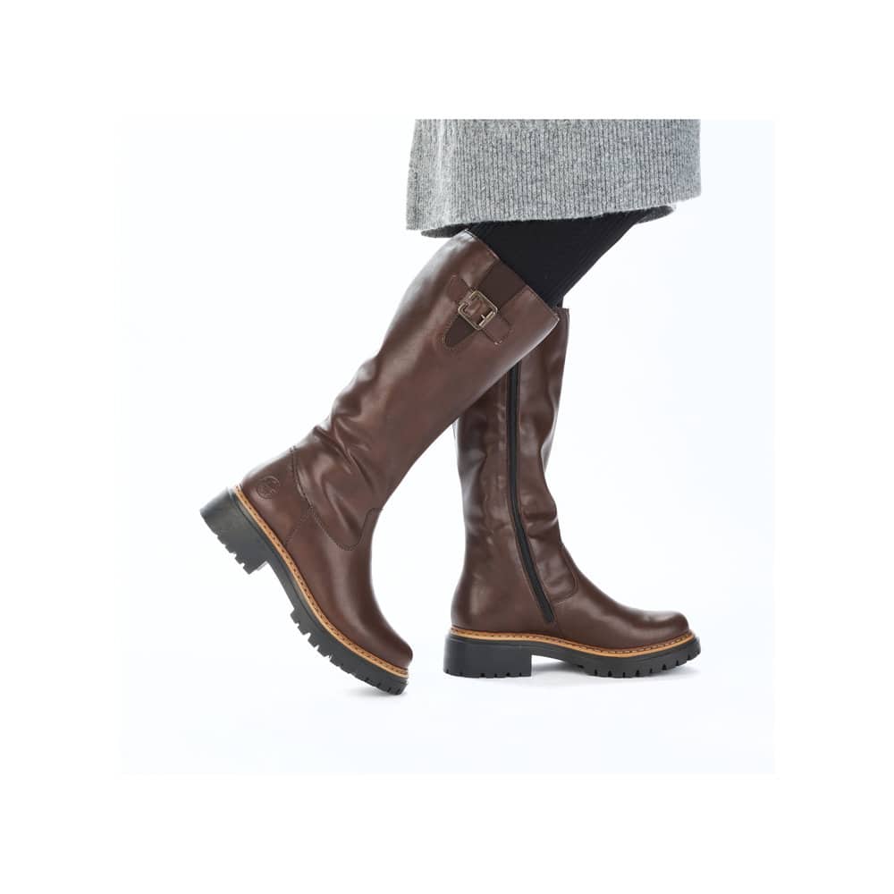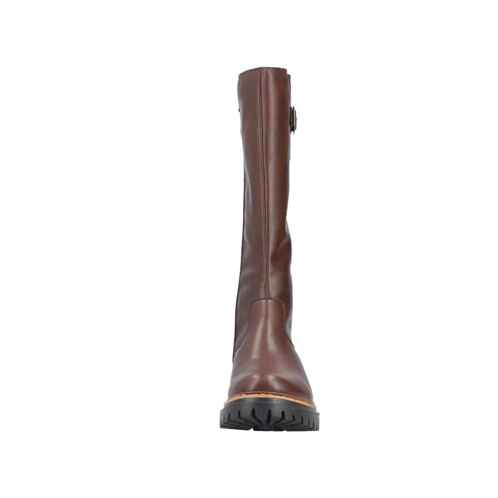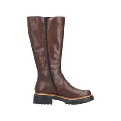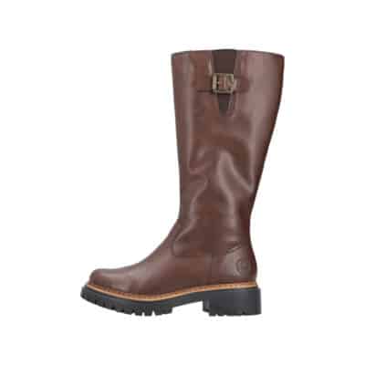 Rieker Lang støvle til dame i mørkebrun. Flot og elegant støvle, der kombinerer funktionalitet med et moderne design. På siden er der en spænde detaljer som giver et moderne touch, mens den funktionelle lynlås gør modellen nem at komme i og af. Indvendigt er støvlen udstyret med en blød sål og en varm foring, som holder fødderne komfortable og lune. Mens ydersålen med mønster giver øget stødabsorbering og skridsikkerhed.