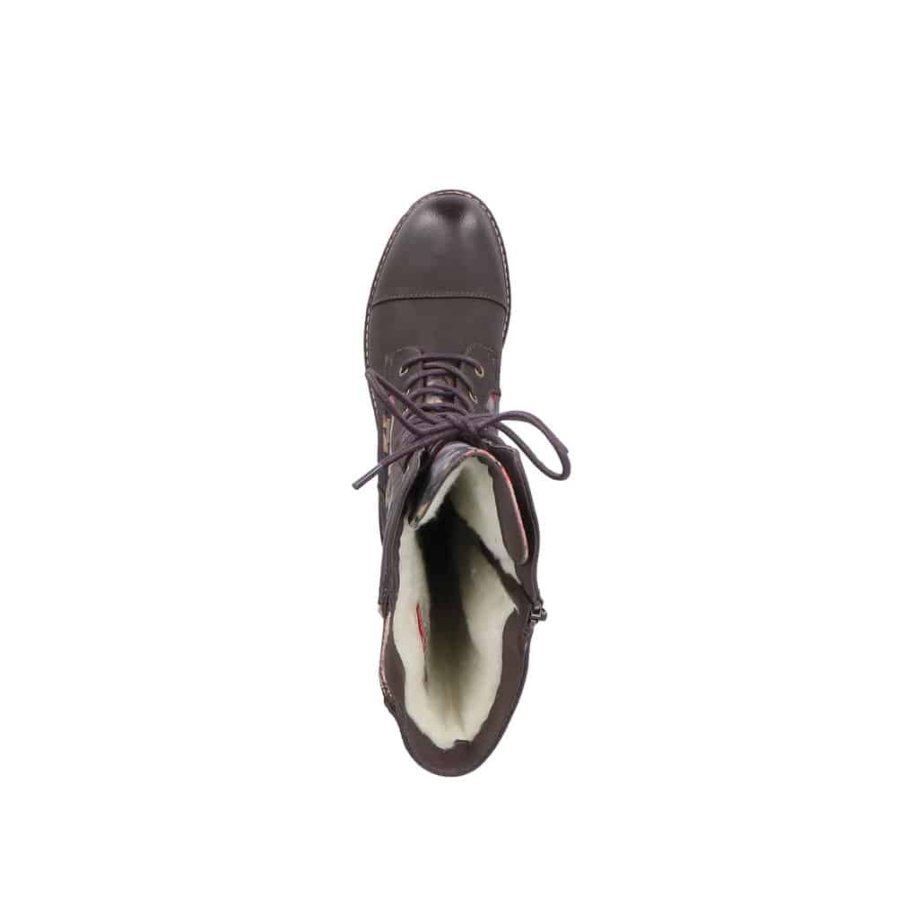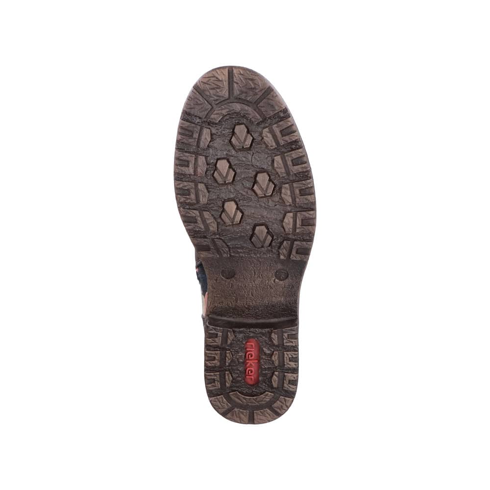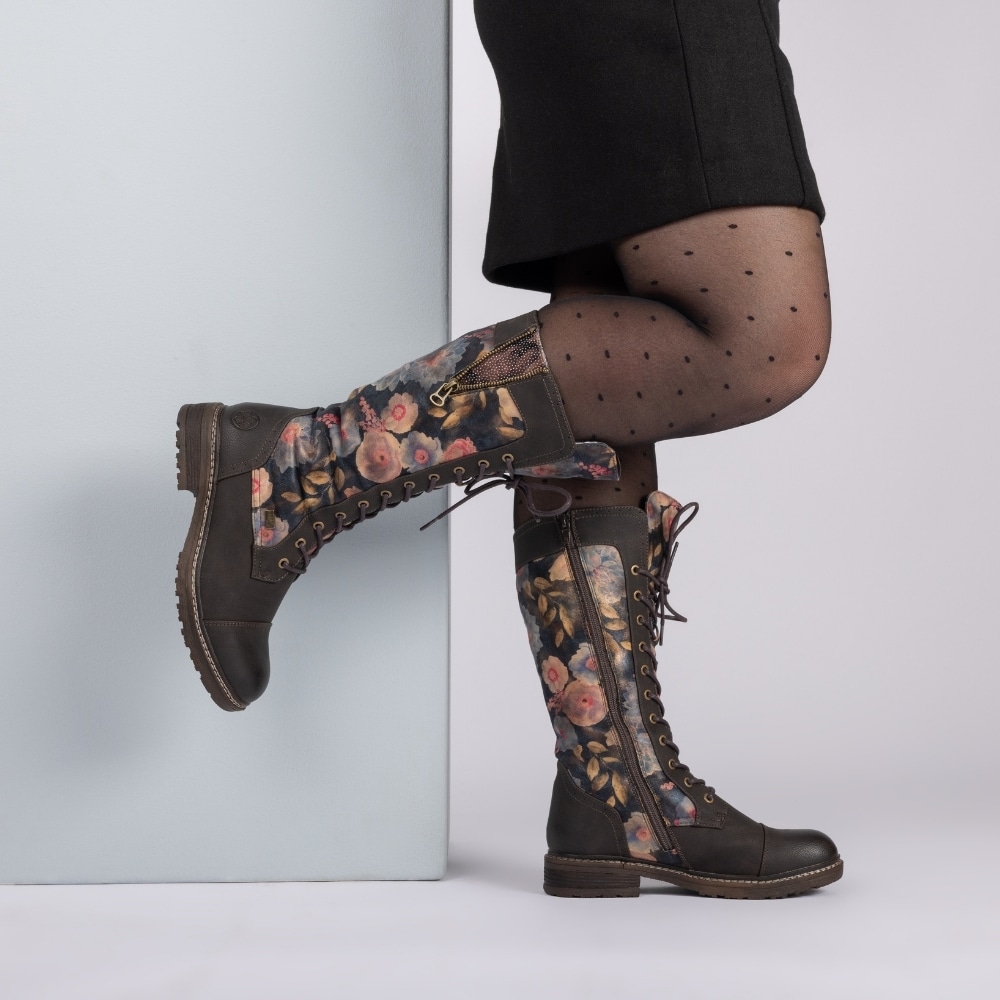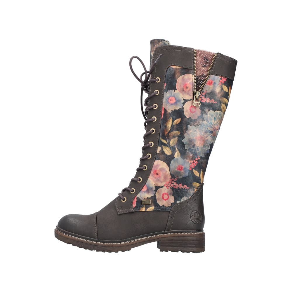 Rieker lang støvle til dame i mørkebrun. Elegant mørkebrun støvle med fine blomster på overdelen og en flot lynlåsdétalje på ydersiden, der tilfører et femint touch. Modellen har snørebånd, som giver en justerbar pasform, samt en funktionel lynlås, der gør det let at komme i og af støvlen. Indvendigt sørger den bløde sål og varme foring for høj komfort hele dagen. Takket være Rieker-Tex er støvlen kraftigt vandafvisende, mens den chunky ydersål med mønster giver både øget stødabsorbering og skridsikkerhed.