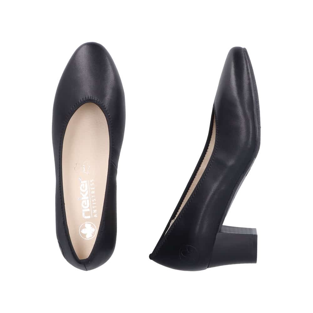 Rieker pumps til dame i sort. Disse pumps forener klassisk elegance med funktionel komfort. Med en overdel i læder og en blød læderindersål får du en sko, der både holder længe og føles behagelig. Hælen er 5 cm høj og giver et feminint løft uden at gå på kompromis med komforten. Rieker Antistress teknologien gør skoen fleksibel og let at have på i mange timer. Ydersålen er mønstret og øger både skridsikkerhed og stødabsorbering.