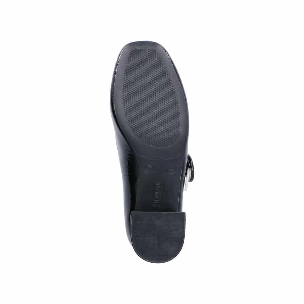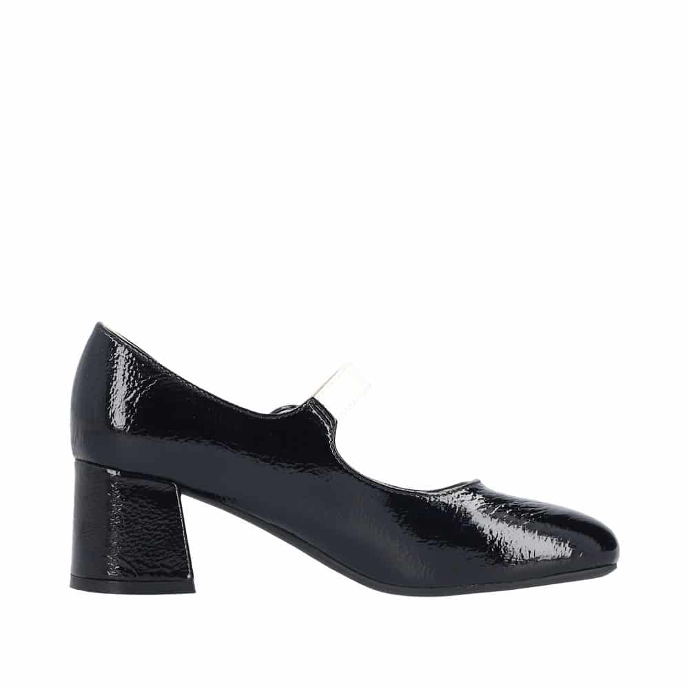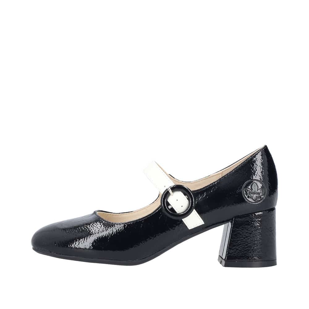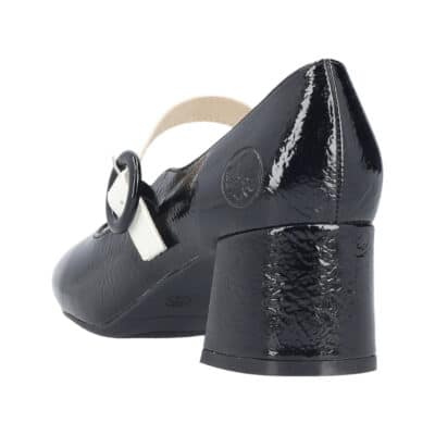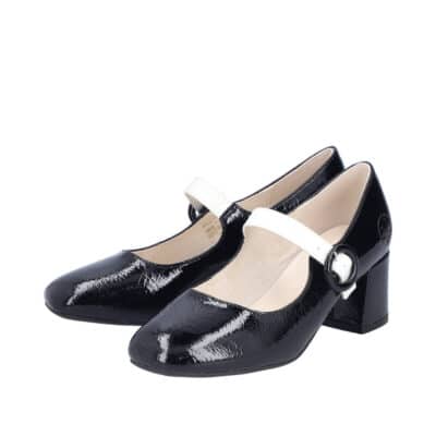 Rieker pumps til dame i sort lak med hvid rem og spænde samt indersål af skind med en blokhæl på 6 cm