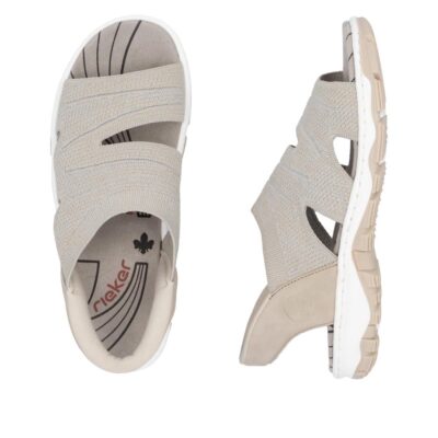 Rieker Ready 2 Go sandal til dame i beige. Let og komfortabel beige sandal, der forener stil med praktisk funktionalitet. Med Hands Free Ready 2 Go-teknologien kan sandalen nemt trædes i uden brug af hænder, mens den faste hælkappe giver ekstra stabilitet. Den bløde indersål med Rieker Antistress-teknologi sikrer en behagelig pasform hele dagen. Den mønstrede ydersål sørger for sikkert greb, så du kan bevæge dig sikkert på ethvert underlag.