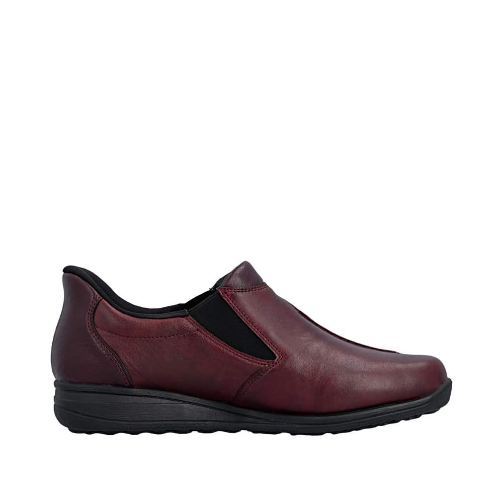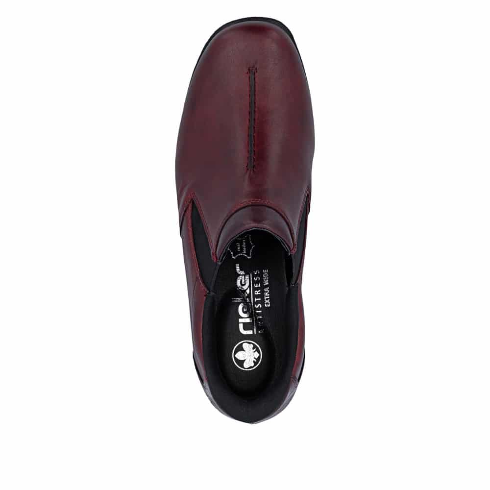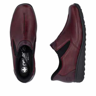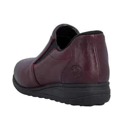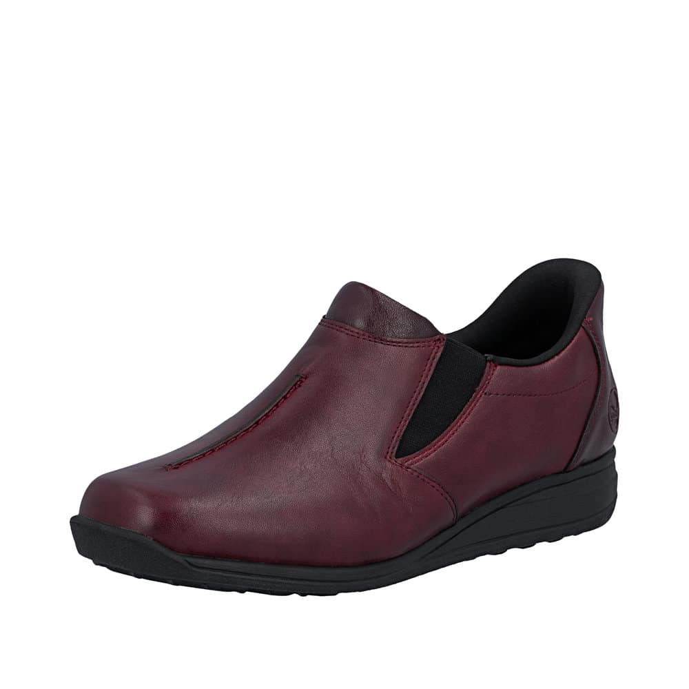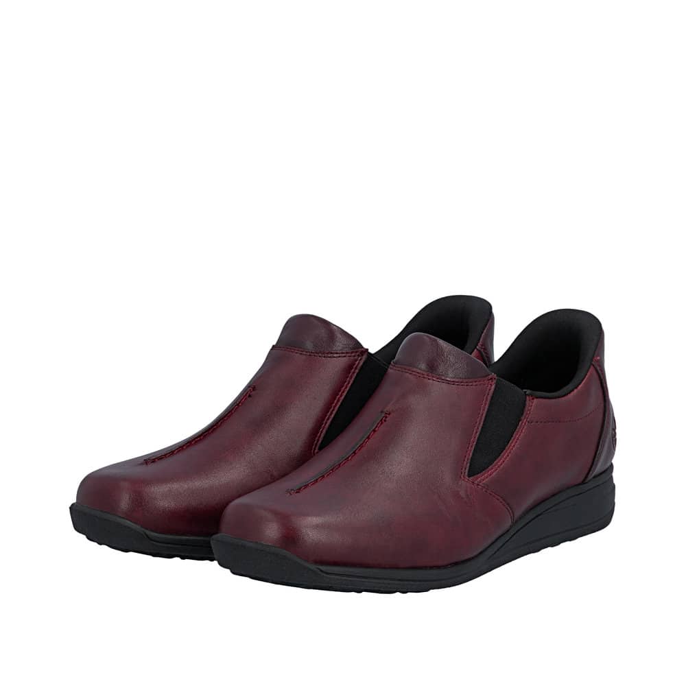 Rieker Ready 2 Go sko til dame i rød. Stilfuld damesko med rød skindoverdel og en lakdetalje, der giver et elegant look. Skoen er udstyret med to elastikker i siderne for en god pasform og nem brug i hverdagen. Ready 2 Go kombineret med en fast hælkappe gør skoen let at komme i uden brug af hænder. Indvendigt finder du en blød og udtagelig skindsål samt ekstra bredde (H), som giver fleksibilitet og behagelig en komfort. Ydersålen med mønster giver øget støtte og skridsikkerhed.