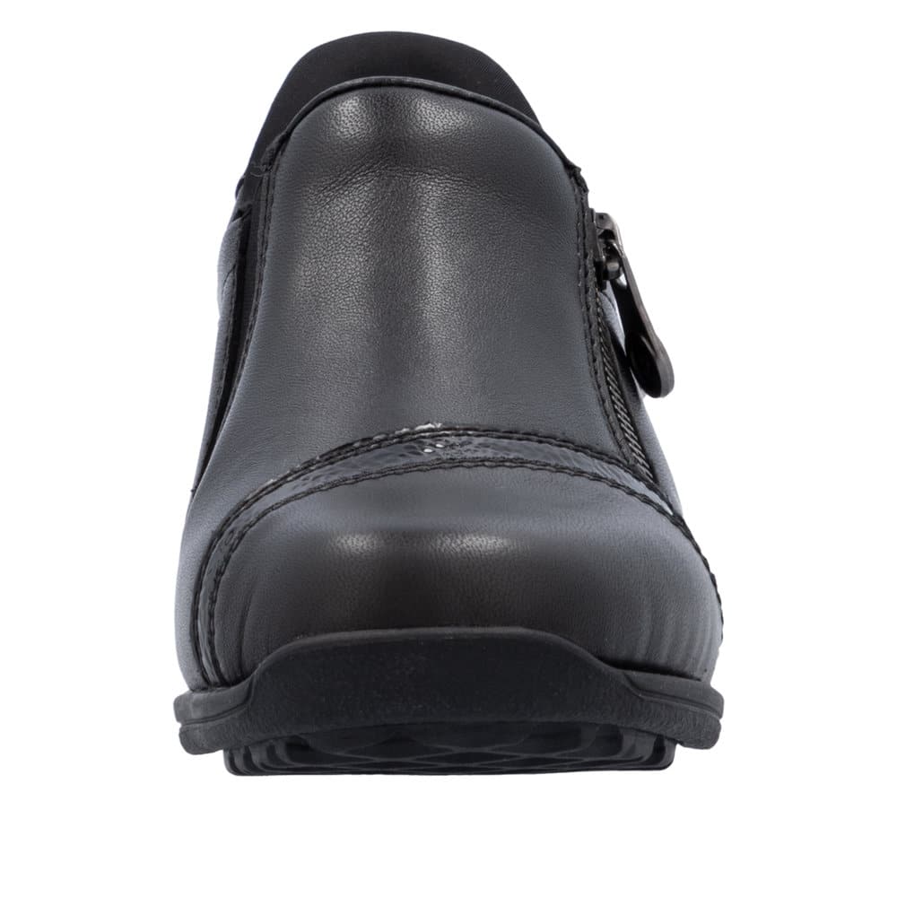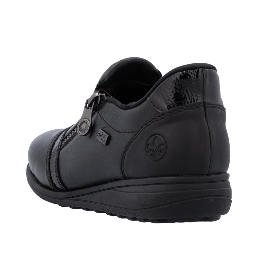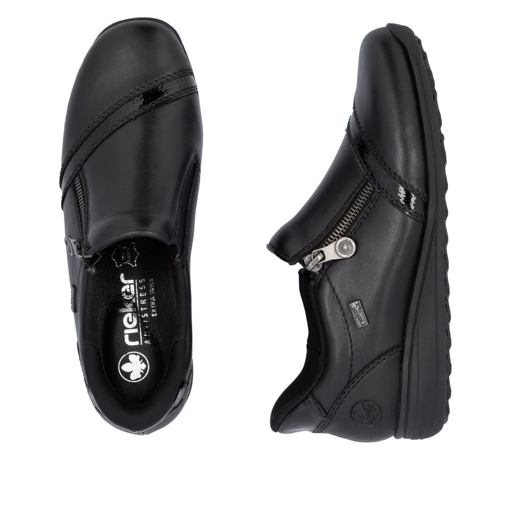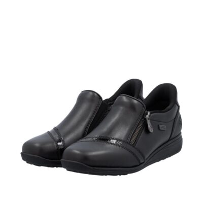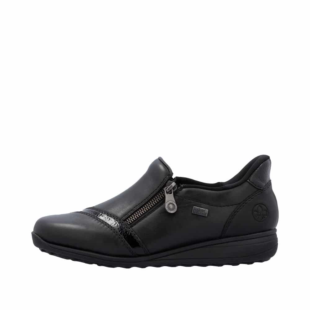Rieker Ready 2 Go sko til dame i sort. Denne dame sko kombinerer stil og funktion i et moderne design. Den flotte sorte farve og de fine lakdetaljer giver et elegant look, mens skindoverdelen tilfører kvalitet. Skoen har en praktisk lynlås på ydersiden og er udviklet med Hands Free Ready 2 Go teknologi, der sammen med den faste hælkappe gør det nemt at tage skoen på uden hænder. Indvendigt finder du en blød, udtagelig sål med ekstra bredde H for optimal komfort. Rieker Tex gør modellen kraftigt vandafvisende, og den stødabsorberende ydersål med godt mønster giver øget støtte og skridsikkerhed.