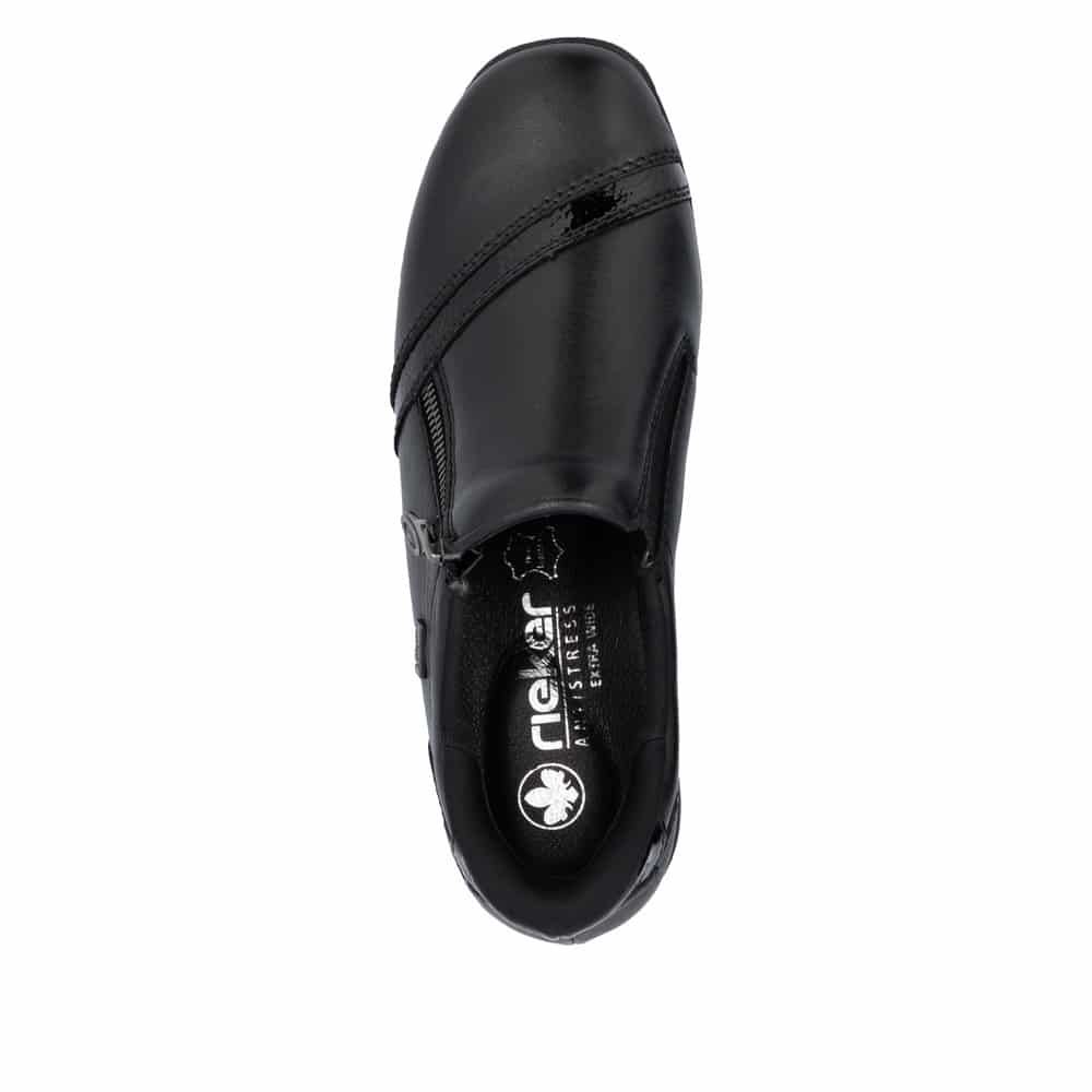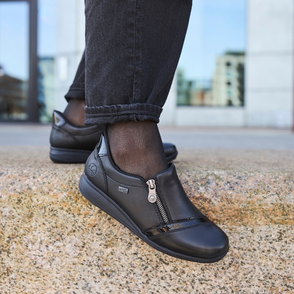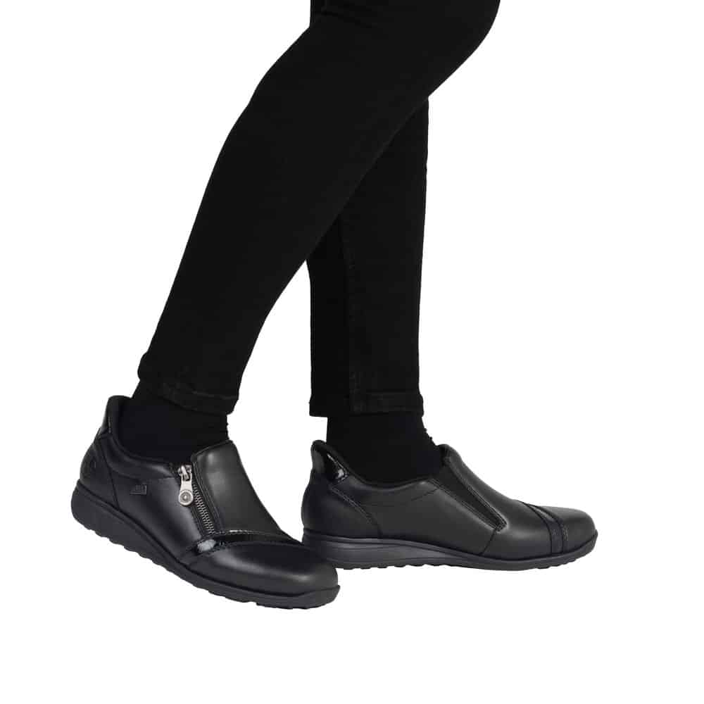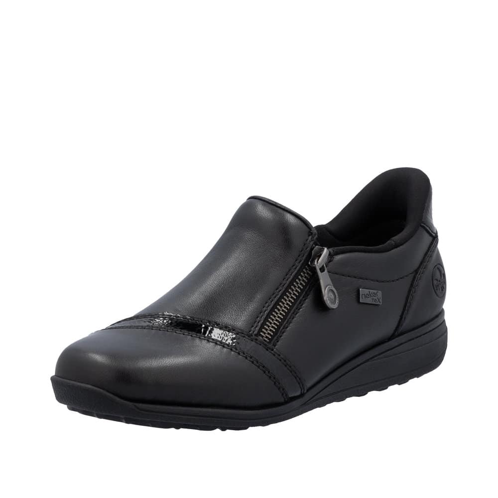 Rieker Ready 2 Go sko til dame i sort. Denne dame sko kombinerer stil og funktion i et moderne design. Den flotte sorte farve og de fine lakdetaljer giver et elegant look, mens skindoverdelen tilfører kvalitet. Skoen har en praktisk lynlås på ydersiden og er udviklet med Hands Free Ready 2 Go teknologi, der sammen med den faste hælkappe gør det nemt at tage skoen på uden hænder. Indvendigt finder du en blød, udtagelig sål med ekstra bredde H for optimal komfort. Rieker Tex gør modellen kraftigt vandafvisende, og den stødabsorberende ydersål med godt mønster giver øget støtte og skridsikkerhed.